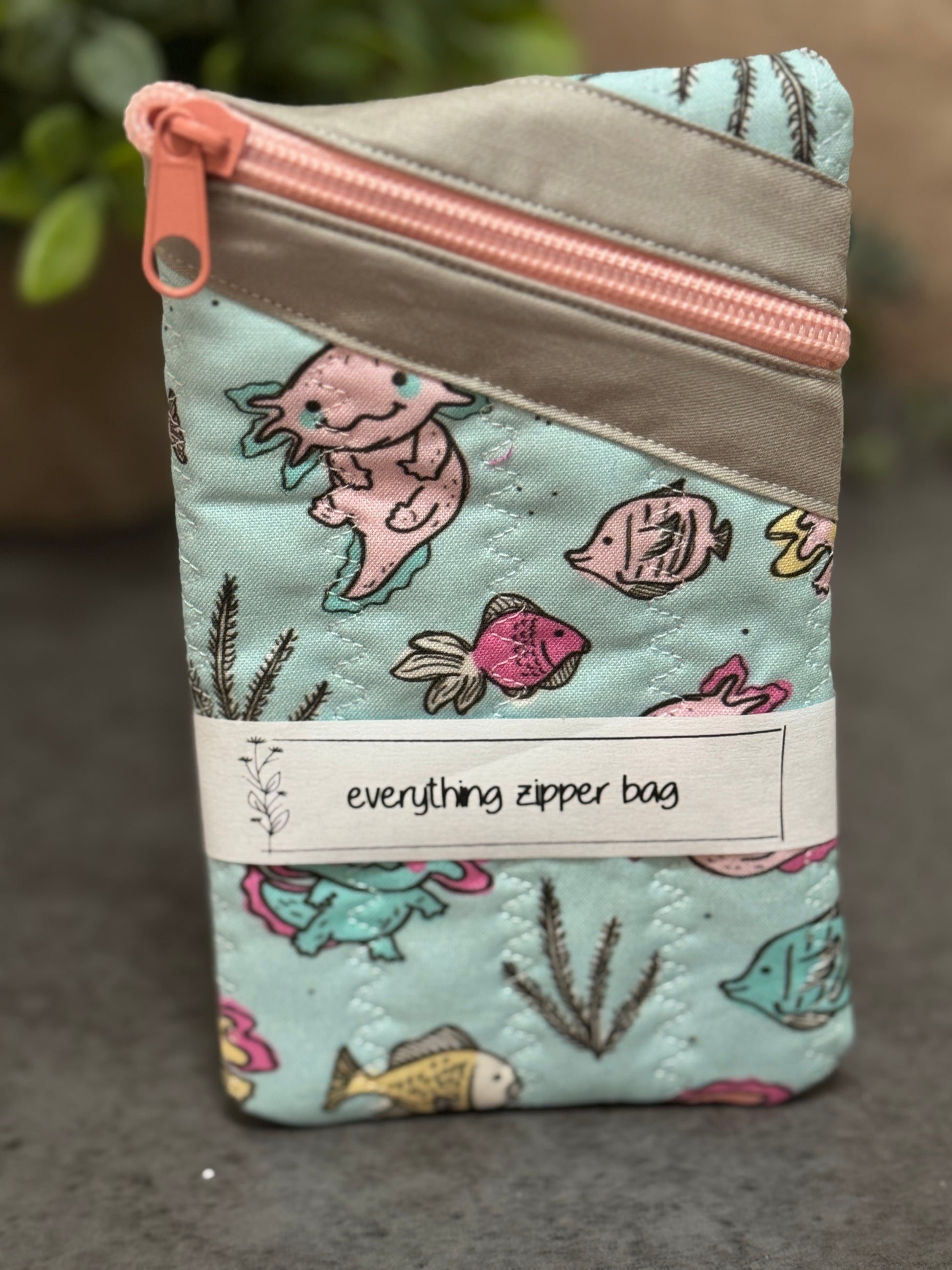Pouch is made from quality 100% cotton, 100% cotton batting, and a nylon zipper. Interior seams are serged for longevity. To spot clean, use a mild detergent and cold water. Iron on high (but avoid the zipper!) to get rid of any wrinkles.