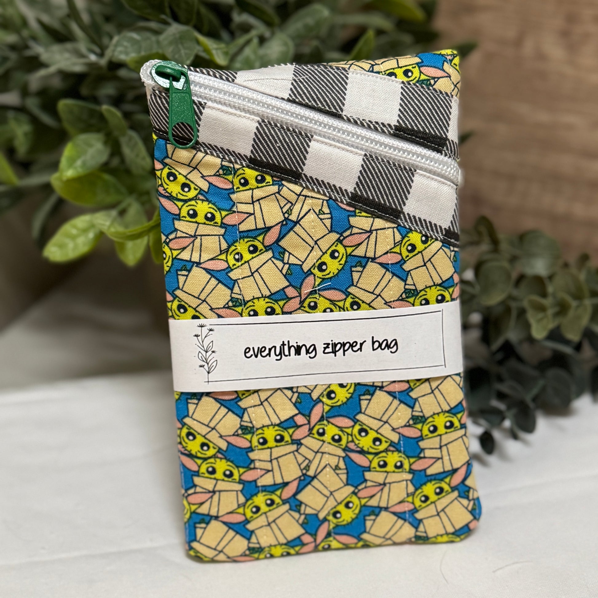 Pouch is made from quality 100% cotton, 100% cotton batting, and a nylon zipper. Interior seams are serged for longevity. To spot clean, use a mild detergent and cold water. Iron on high (but avoid the zipper!) to get rid of any wrinkles.