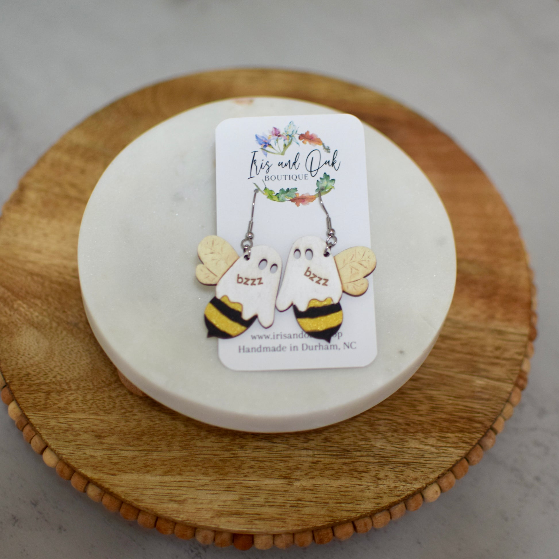 Get ready to buzz around in style this Halloween with our Bee Ghosts Dangles! These handpainted wooden earrings feature a playful twist of a bee dressed up as a spooktacular ghost. Perfect for adding a quirky and unique touch to any outfit. (Bee-ware, these earrings may cause a buzz among your friends!)