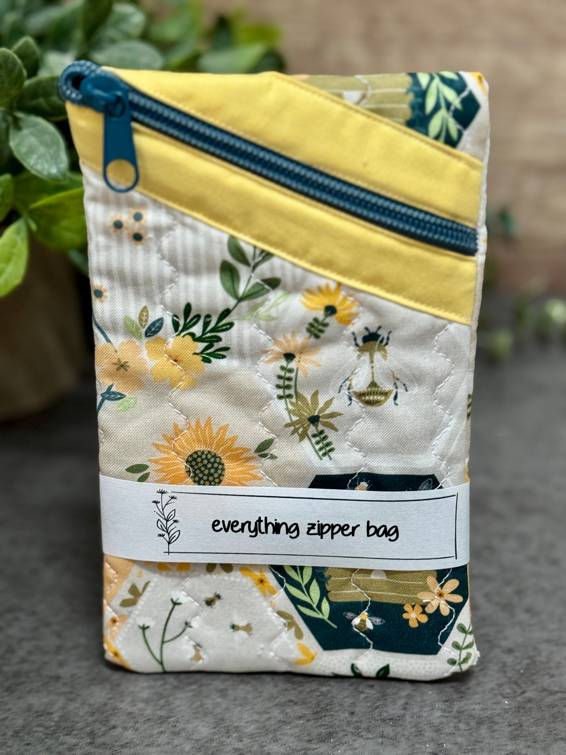 Pouch is made from quality 100% cotton, 100% cotton batting, and a nylon zipper. Interior seams are serged for longevity. To spot clean, use a mild detergent and cold water. Iron on high (but avoid the zipper!) to get rid of any wrinkles.