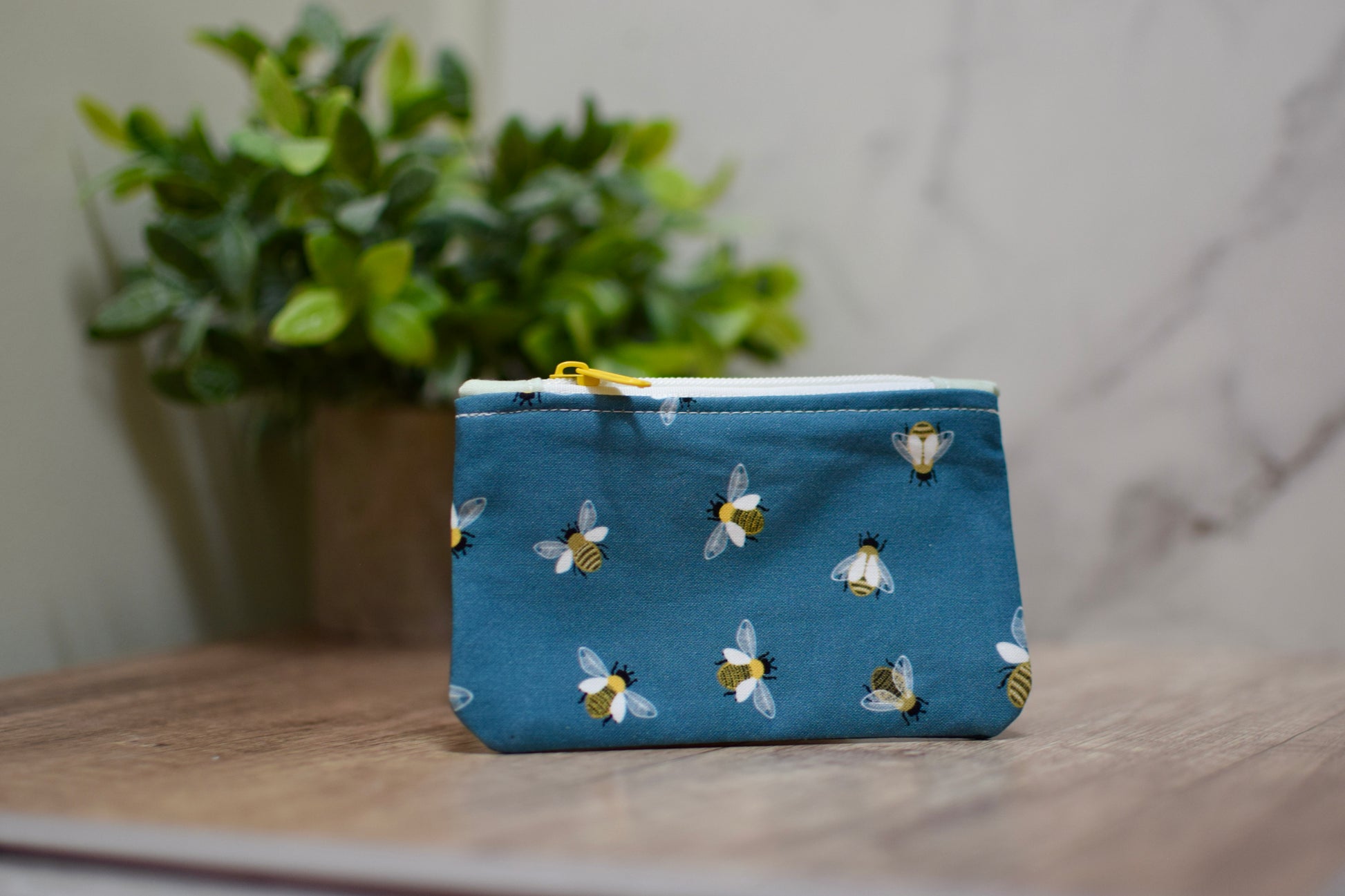 Hand sewn zipper pouch, fully lined. 100% cotton. Spot clean with cool water and mild detergent.