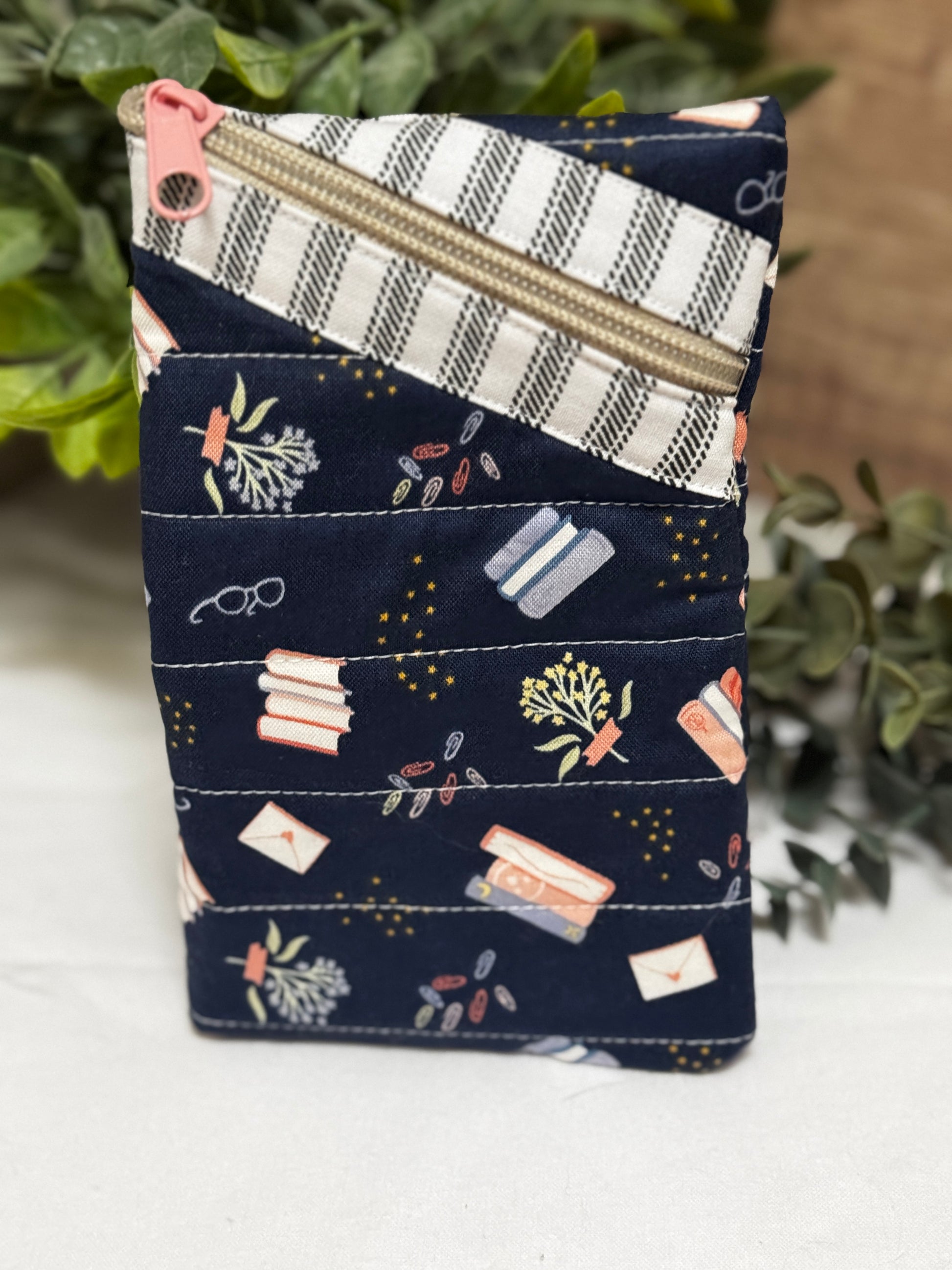Pouch is made from quality 100% cotton, 100% cotton batting, and a nylon zipper. Interior seams are serged for longevity. To spot clean, use a mild detergent and cold water. Iron on high (but avoid the zipper!) to get rid of any wrinkles.