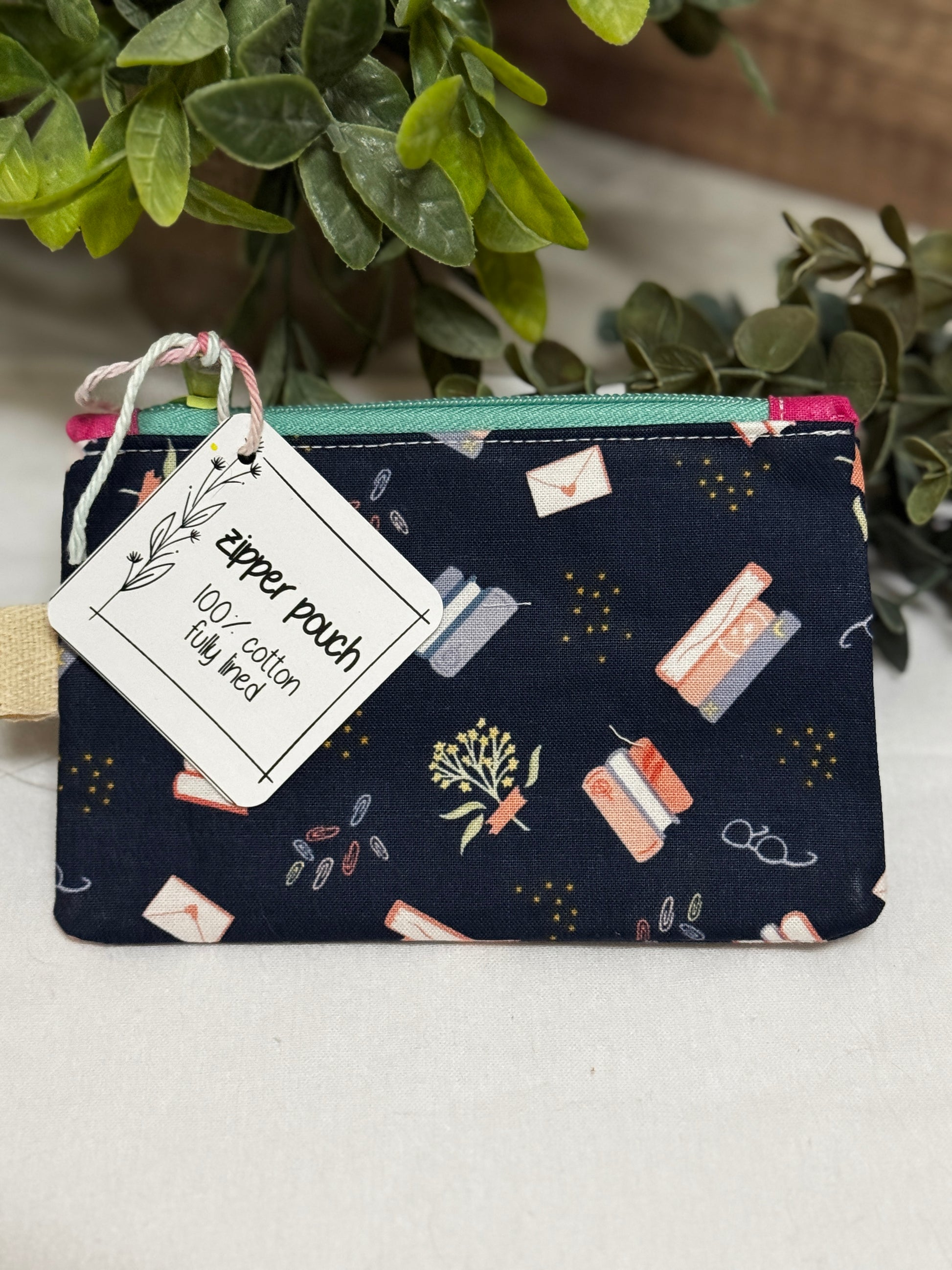 Zipper/Zipper tabs, and interior color will vary from pouch to pouch. All will be in coordinating colors/prints.