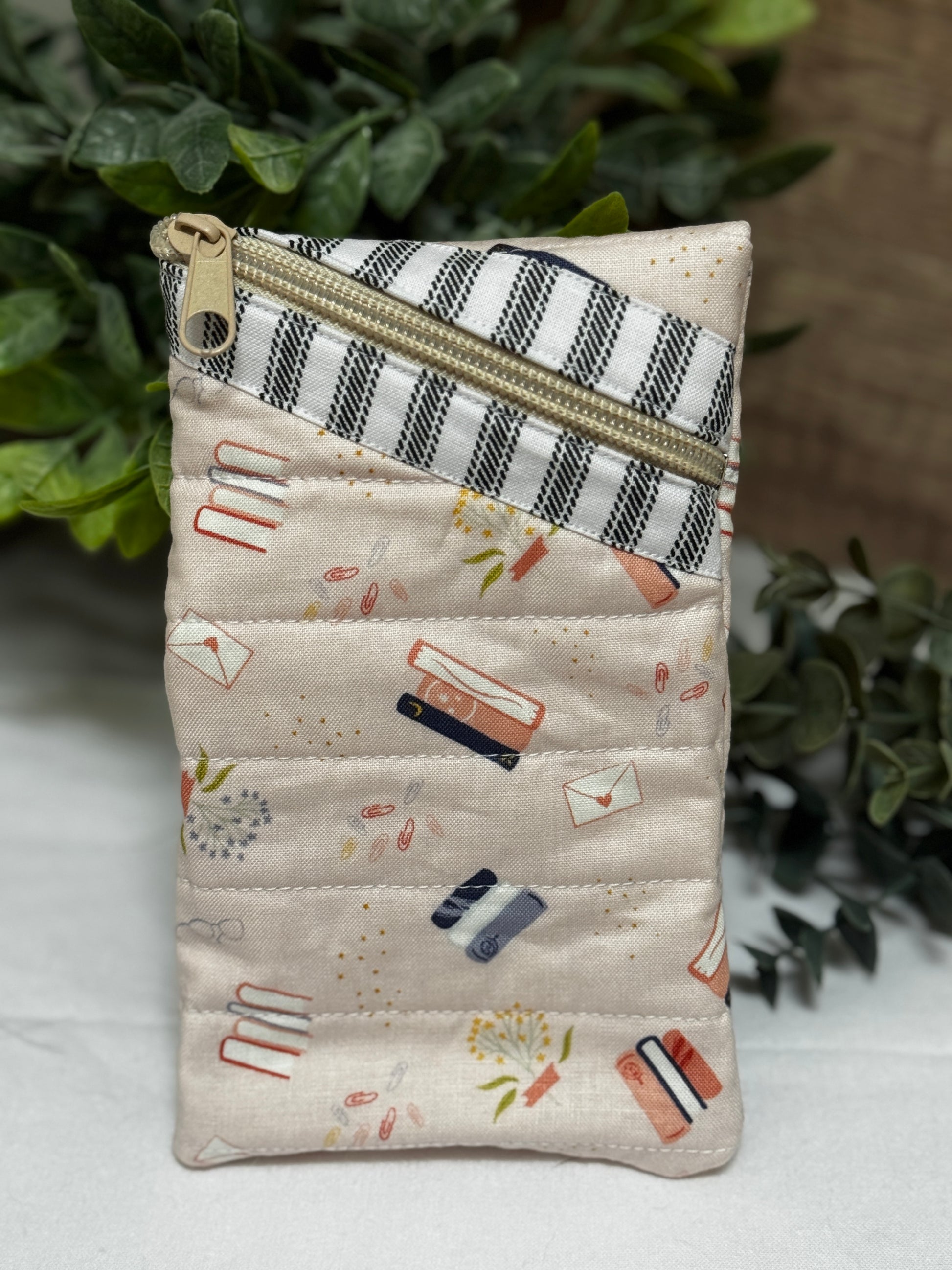 Pouch is made from quality 100% cotton, 100% cotton batting, and a nylon zipper. Interior seams are serged for longevity. To spot clean, use a mild detergent and cold water. Iron on high (but avoid the zipper!) to get rid of any wrinkles.