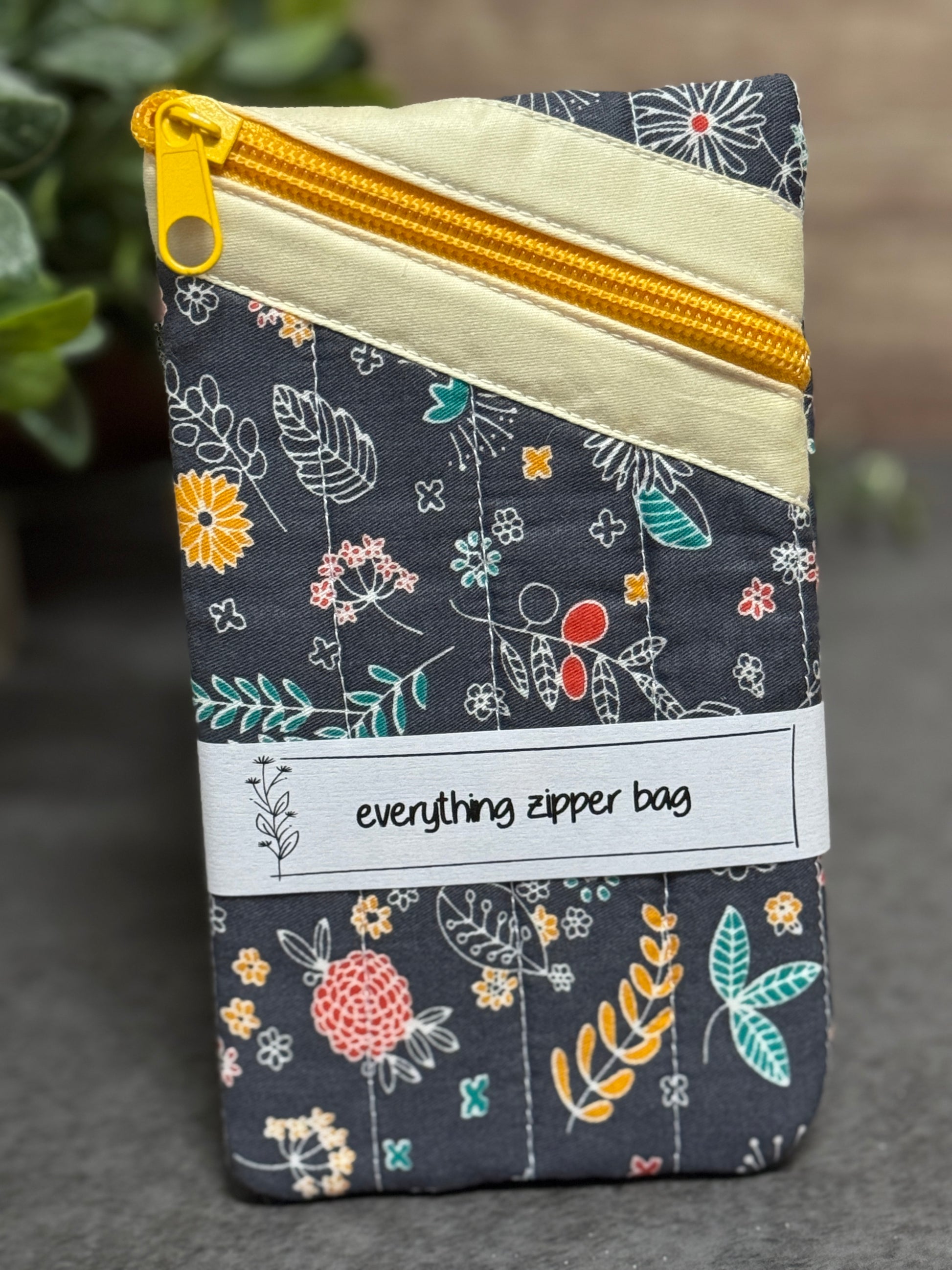 Pouch is made from quality 100% cotton, 100% cotton batting, and a nylon zipper. Interior seams are serged for longevity. To spot clean, use a mild detergent and cold water. Iron on high (but avoid the zipper!) to get rid of any wrinkles.