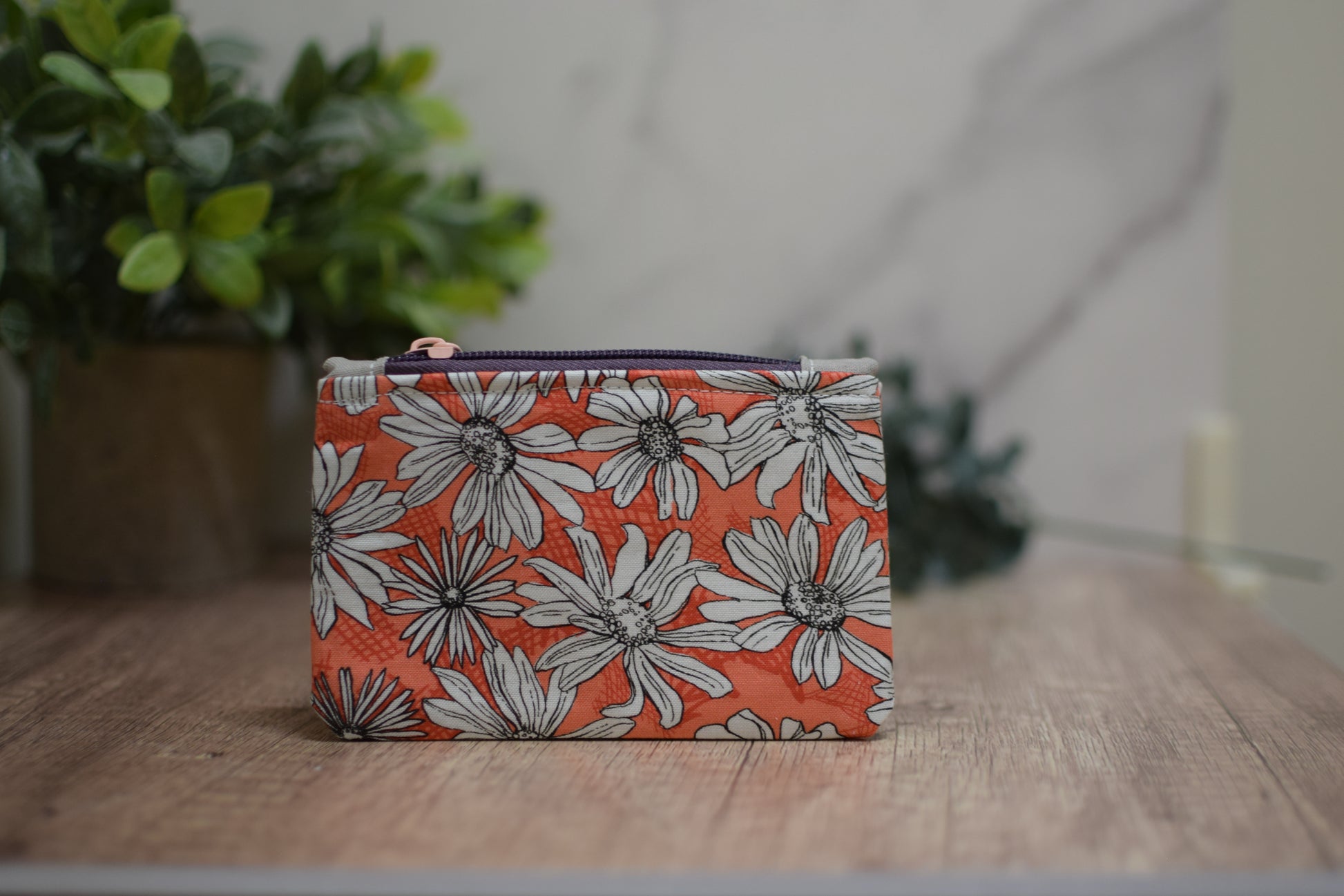 Hand sewn zipper pouch, fully lined. 100% cotton. Spot clean with cool water and mild detergent.