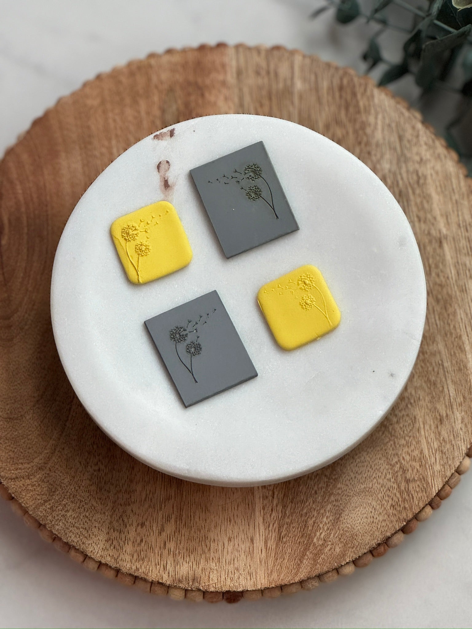 These texture mats are for use on polymer clay and will produce an embossed effect of the design. Design is approximately 0.88" wide x 0.6" tall, while the mat is cut at 1.5x1.5 to provide blank space outside of the design.