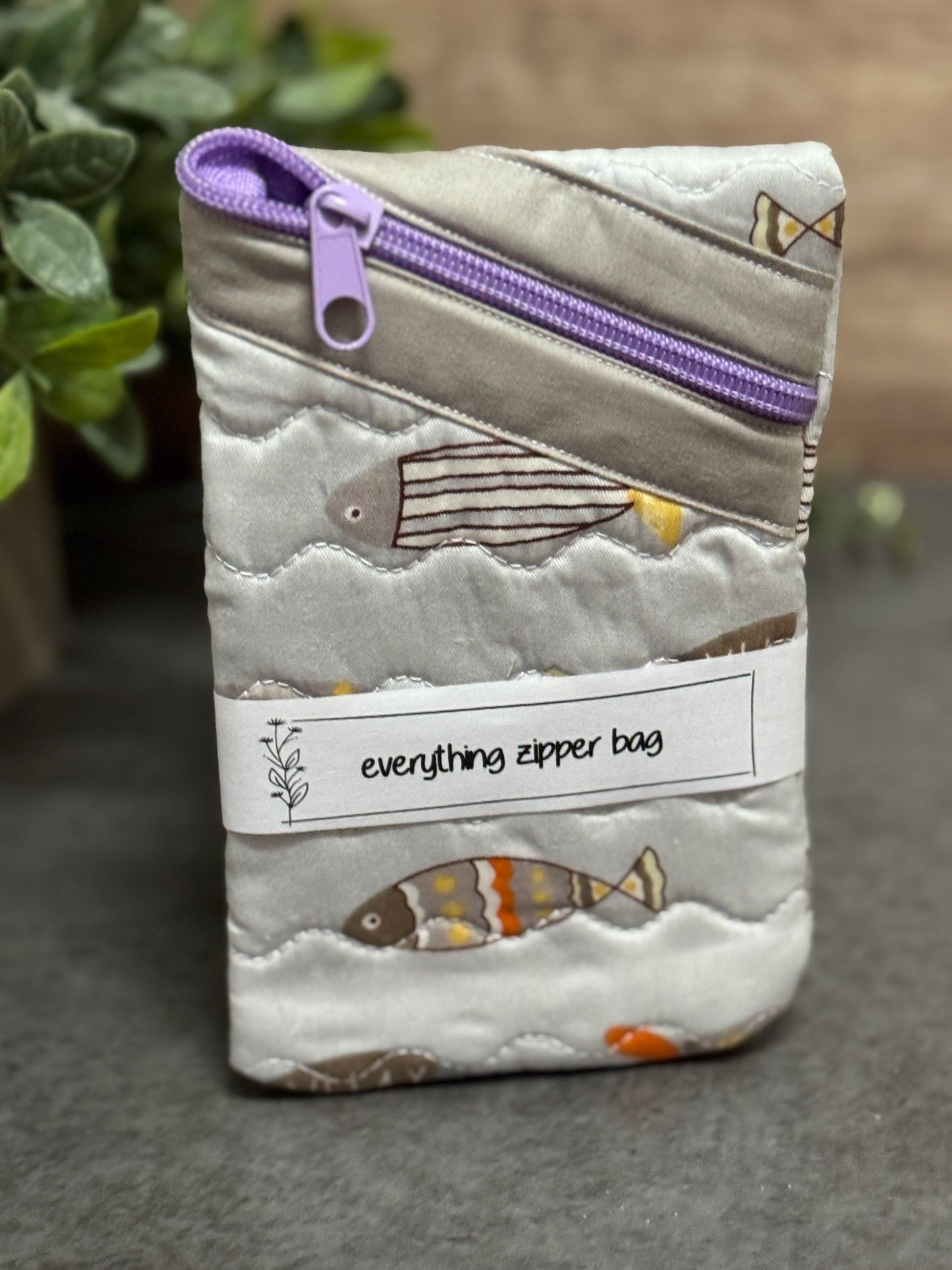 Pouch is made from quality 100% cotton, 100% cotton batting, and a nylon zipper. Interior seams are serged for longevity. To spot clean, use a mild detergent and cold water. Iron on high (but avoid the zipper!) to get rid of any wrinkles.