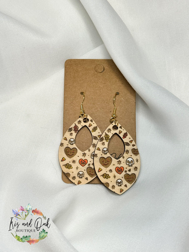 Unleash your spooky style with our Halloween Pattern Wood Earrings. These teardrop shaped earrings feature hand-painted designs of all your favorite Halloween elements. Perfect for adding a touch of whimsy to any outfit. (Boo-tifully crafted for the ultimate Halloween accessory!)