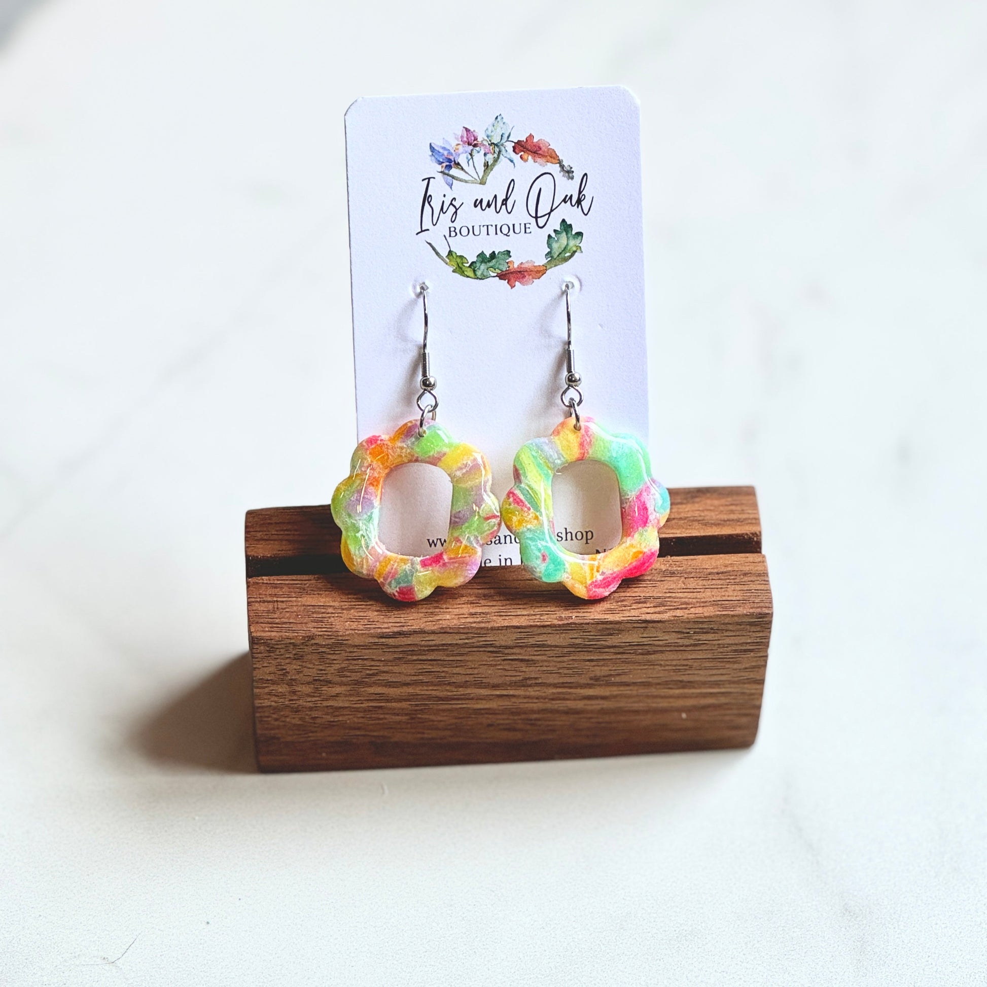 Opal inspired polymer clay with a top coat of resin. Bow posts are STERLING silver, instead of my usual stainless steel, and as such are prone to bending, so be cautious!