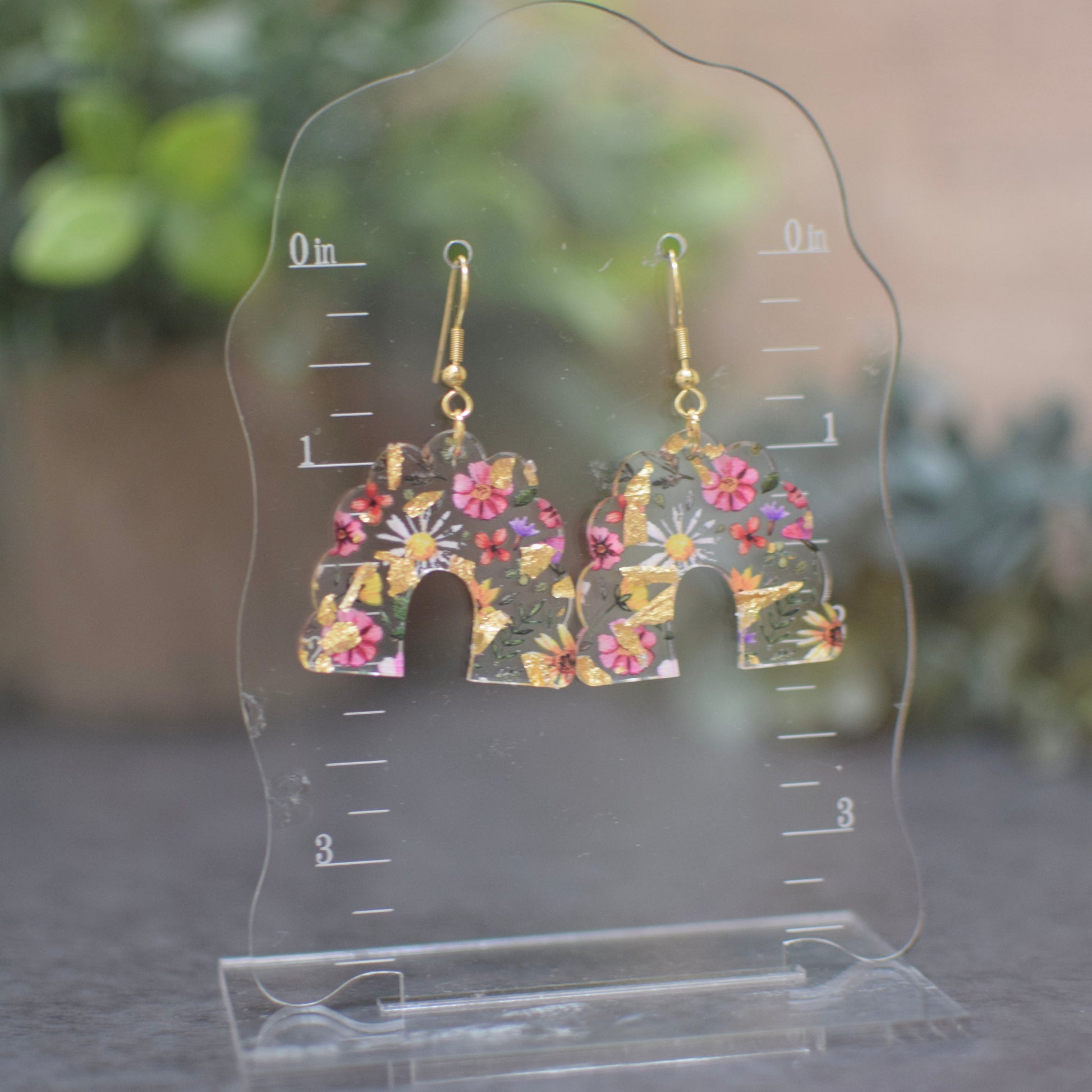Acrylic design with gold flakes and wildflowers.