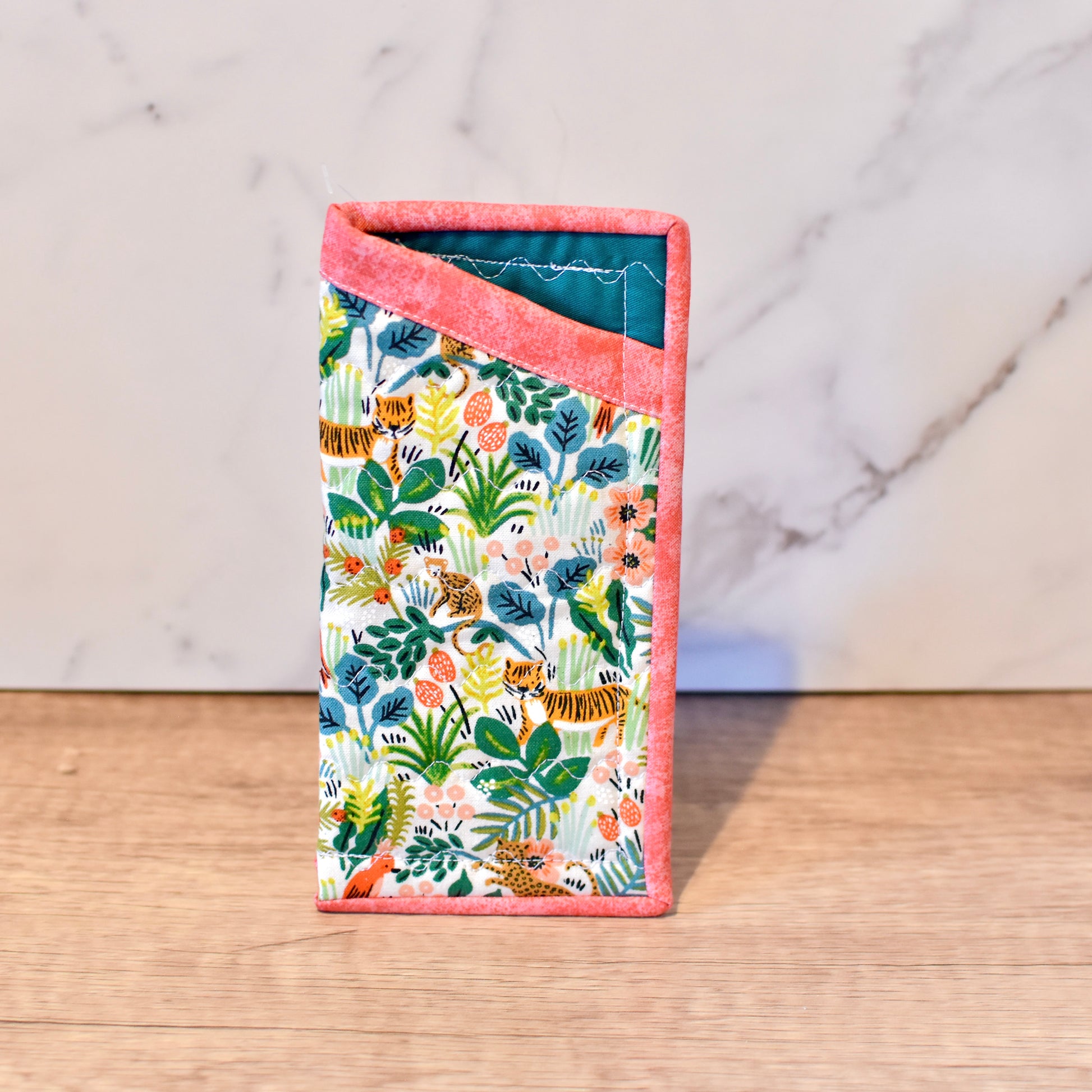 This glasses sleeve is made of high quality 100% cotton fabric with 100% cotton batting to protect your glasses from scratches. Fully lined with a coordinating print.