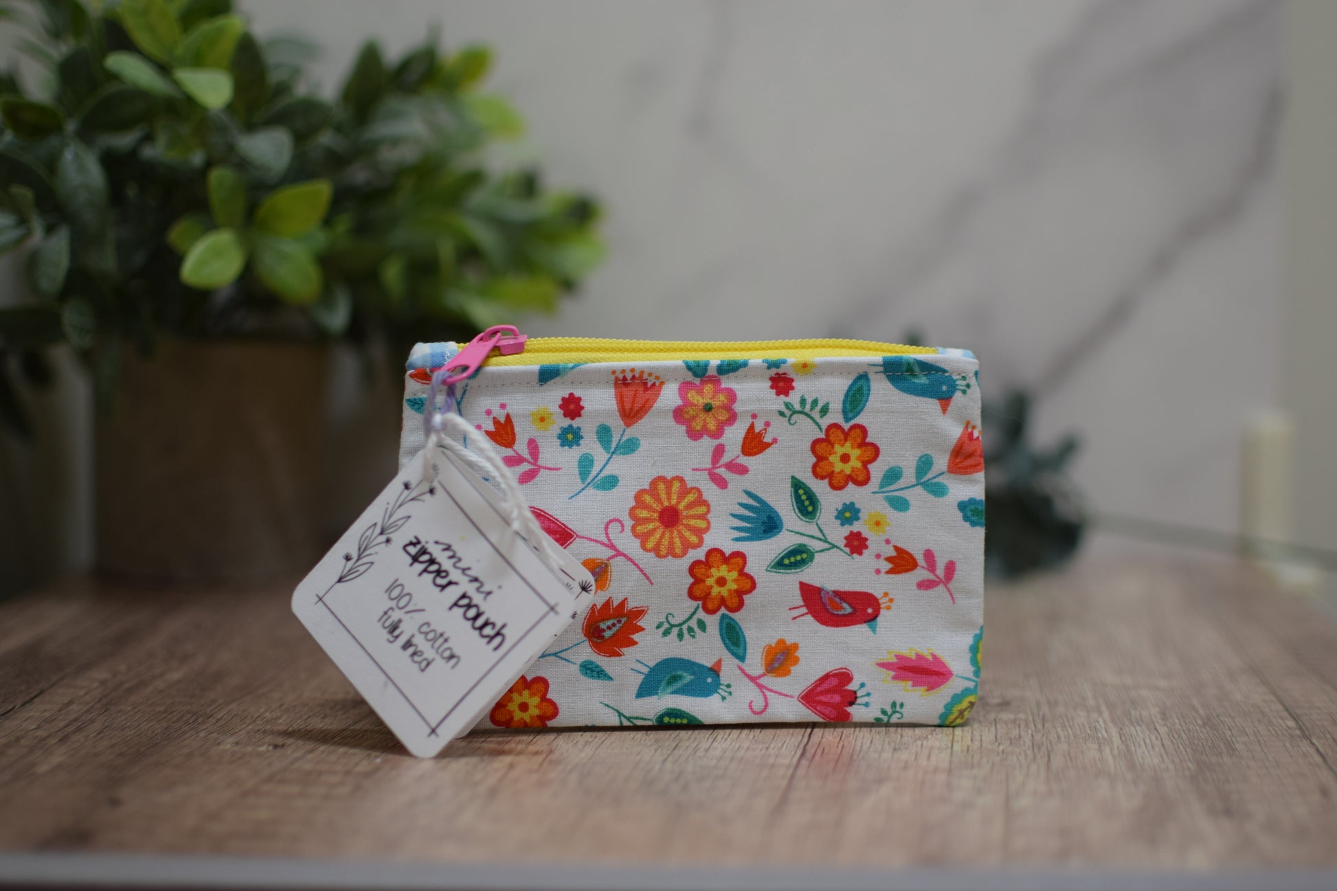 Hand sewn zipper pouch, fully lined. 100% cotton. Spot clean with cool water and mild detergent.