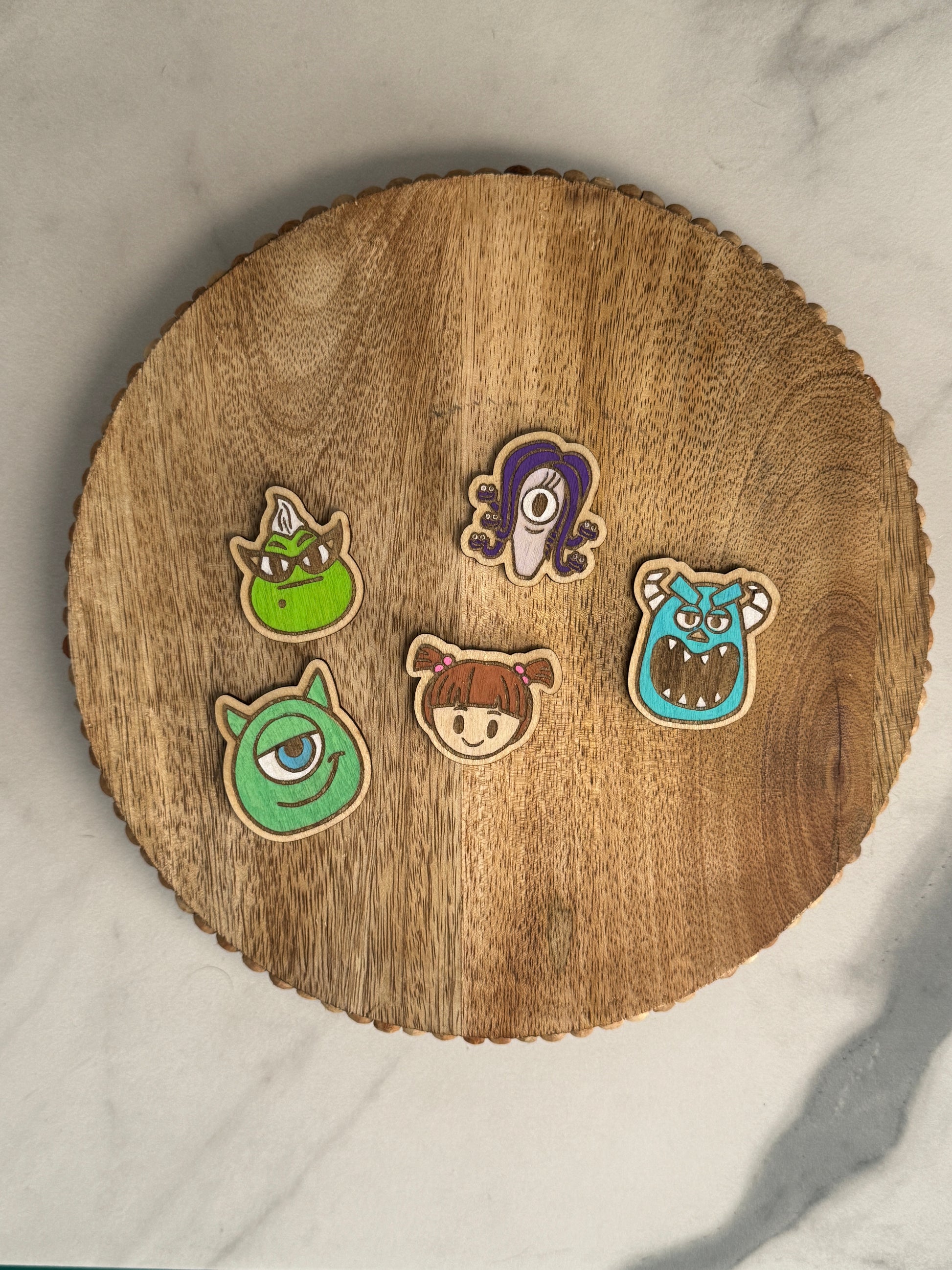 Made of wooden material, each hand-painted magnet stands at 1" - 1.5" tall and backed with a strong magnet. Magnets are super glued, but please take care around children.