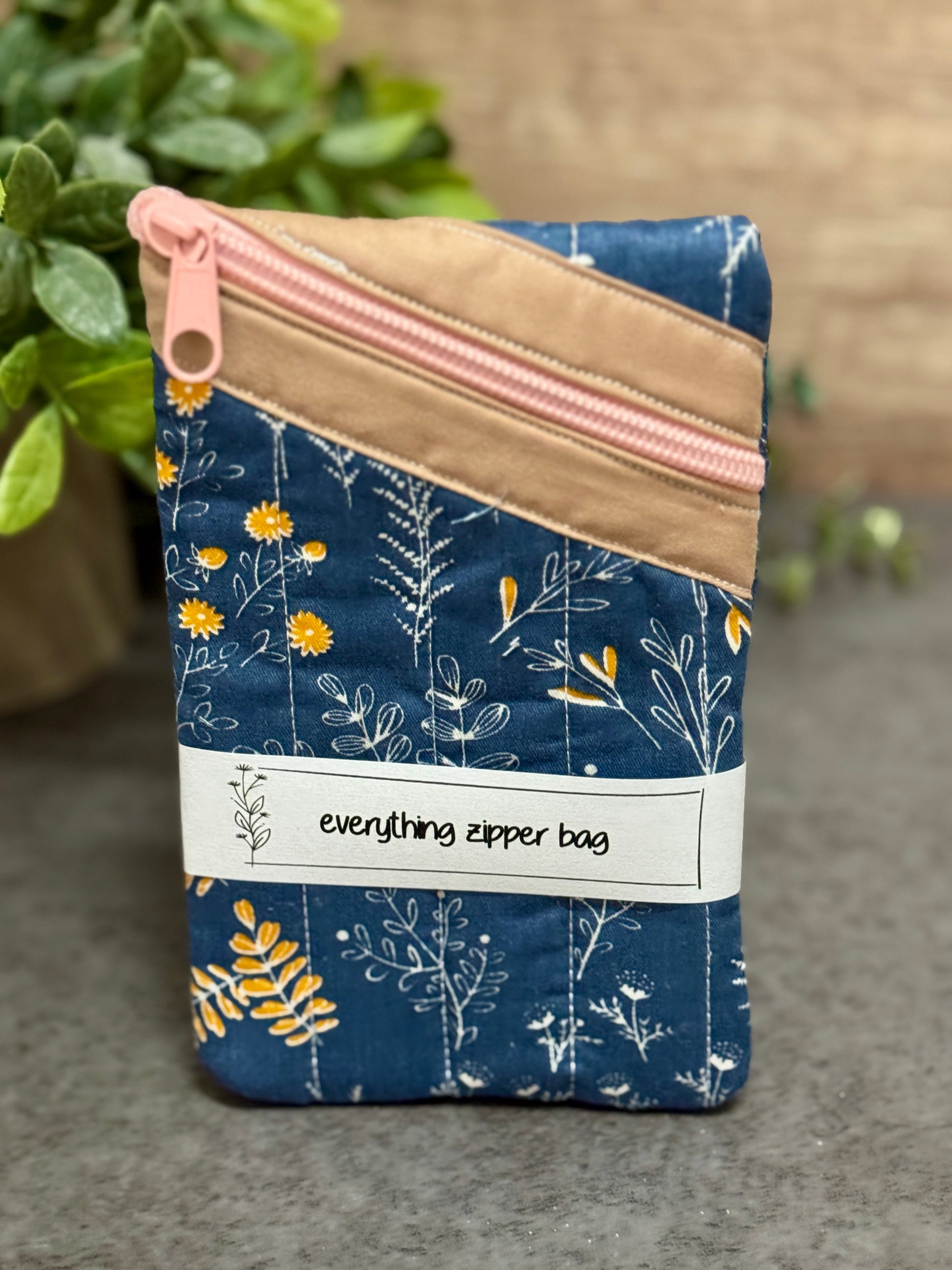 Pouch is made from quality 100% cotton, 100% cotton batting, and a nylon zipper. Interior seams are serged for longevity. To spot clean, use a mild detergent and cold water. Iron on high (but avoid the zipper!) to get rid of any wrinkles.
