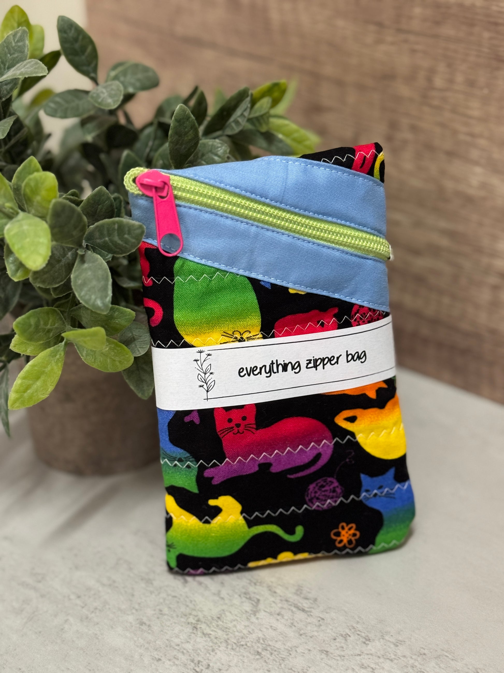 Each is handmade and I strive to keep the colors consistent when I make multiples, but note that the pouch you order may differ slightly in the part of the fabric pattern that is visible, the coordinating binding color, the zipper pull, and the zipper.