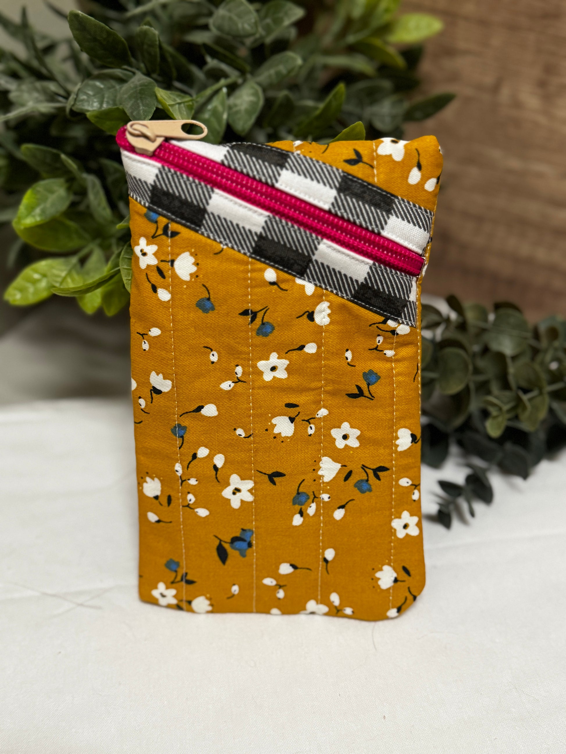 Pouch is made from quality 100% cotton, 100% cotton batting, and a nylon zipper. Interior seams are serged for longevity. To spot clean, use a mild detergent and cold water. Iron on high (but avoid the zipper!) to get rid of any wrinkles.
