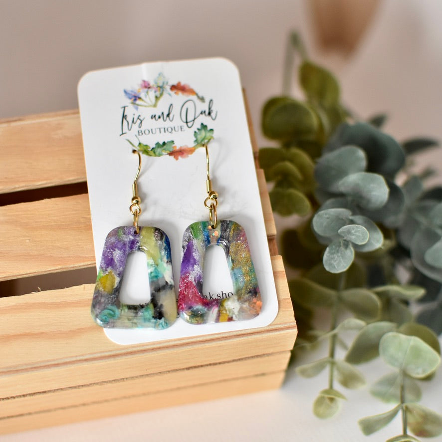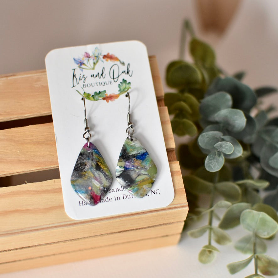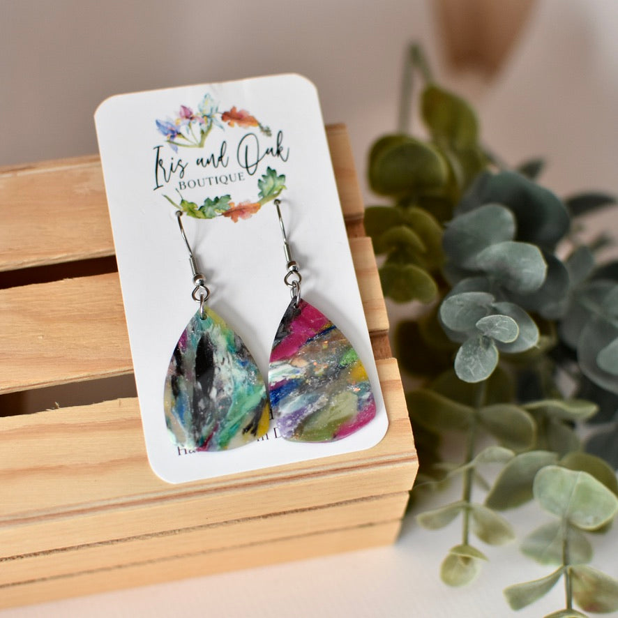 All polymer clay earrings are handmade using high quality polymer clay and other materials. Earrings may use foil leaf, mica powder, alcohol inks, and acrylic paint in the final designs.