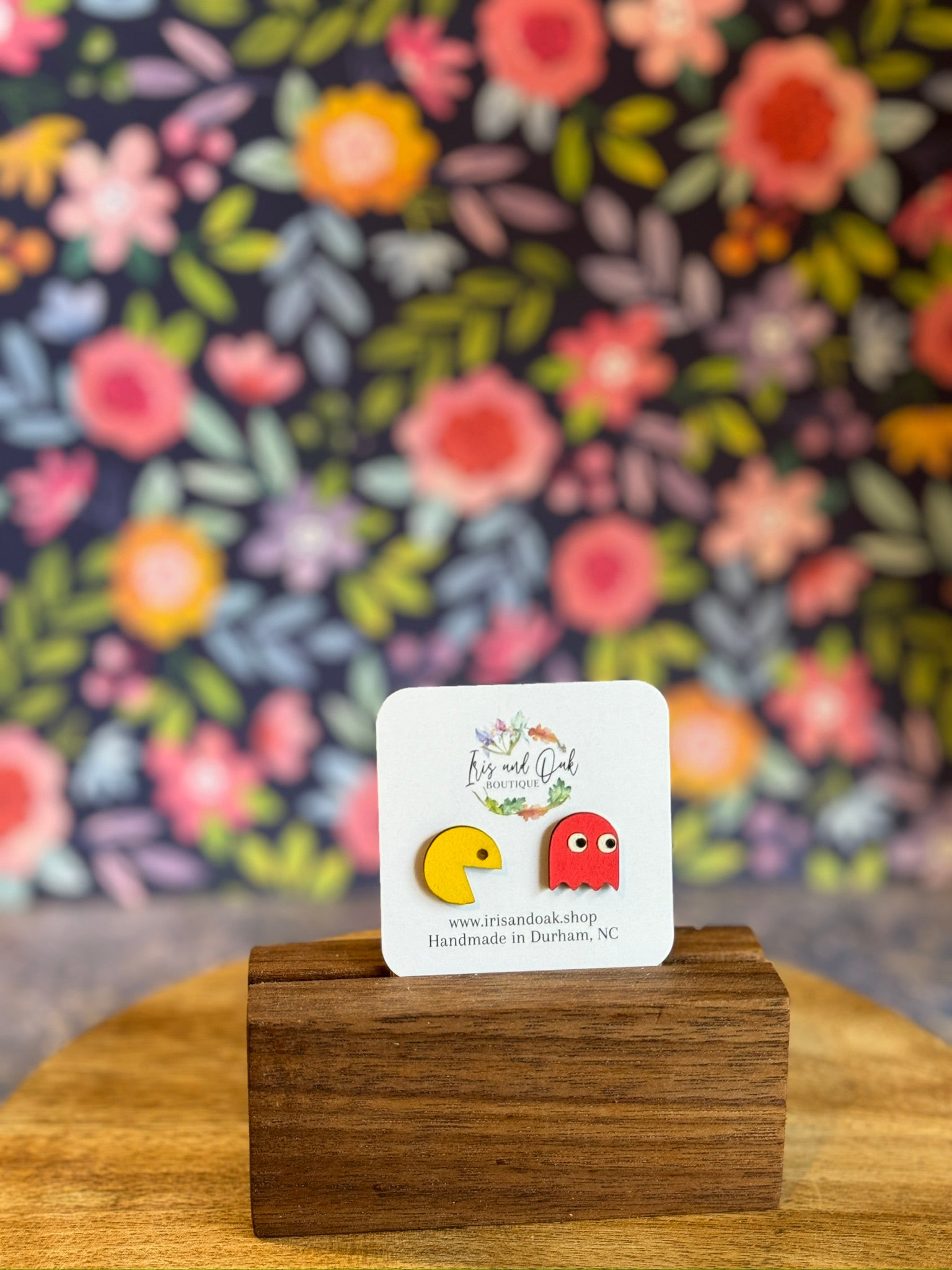 Add a playful touch to your style with these "pacman" earrings. Made of hand-painted wood, these studs will give you a cute and unique look. Perfect for any video game lover or anyone looking for a fun accessory.