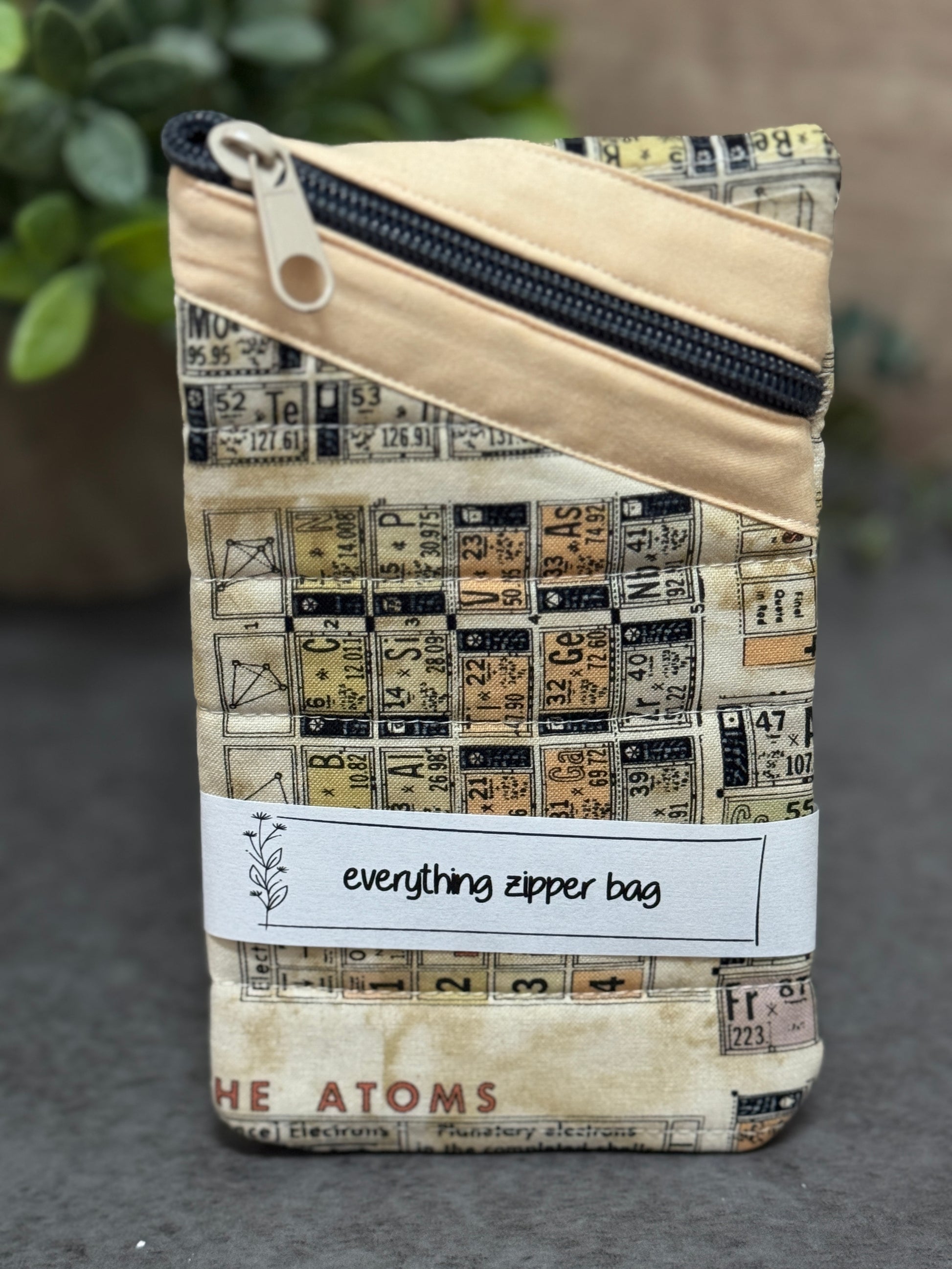 Pouch is made from quality 100% cotton, 100% cotton batting, and a nylon zipper. Interior seams are serged for longevity. To spot clean, use a mild detergent and cold water. Iron on high (but avoid the zipper!) to get rid of any wrinkles.
