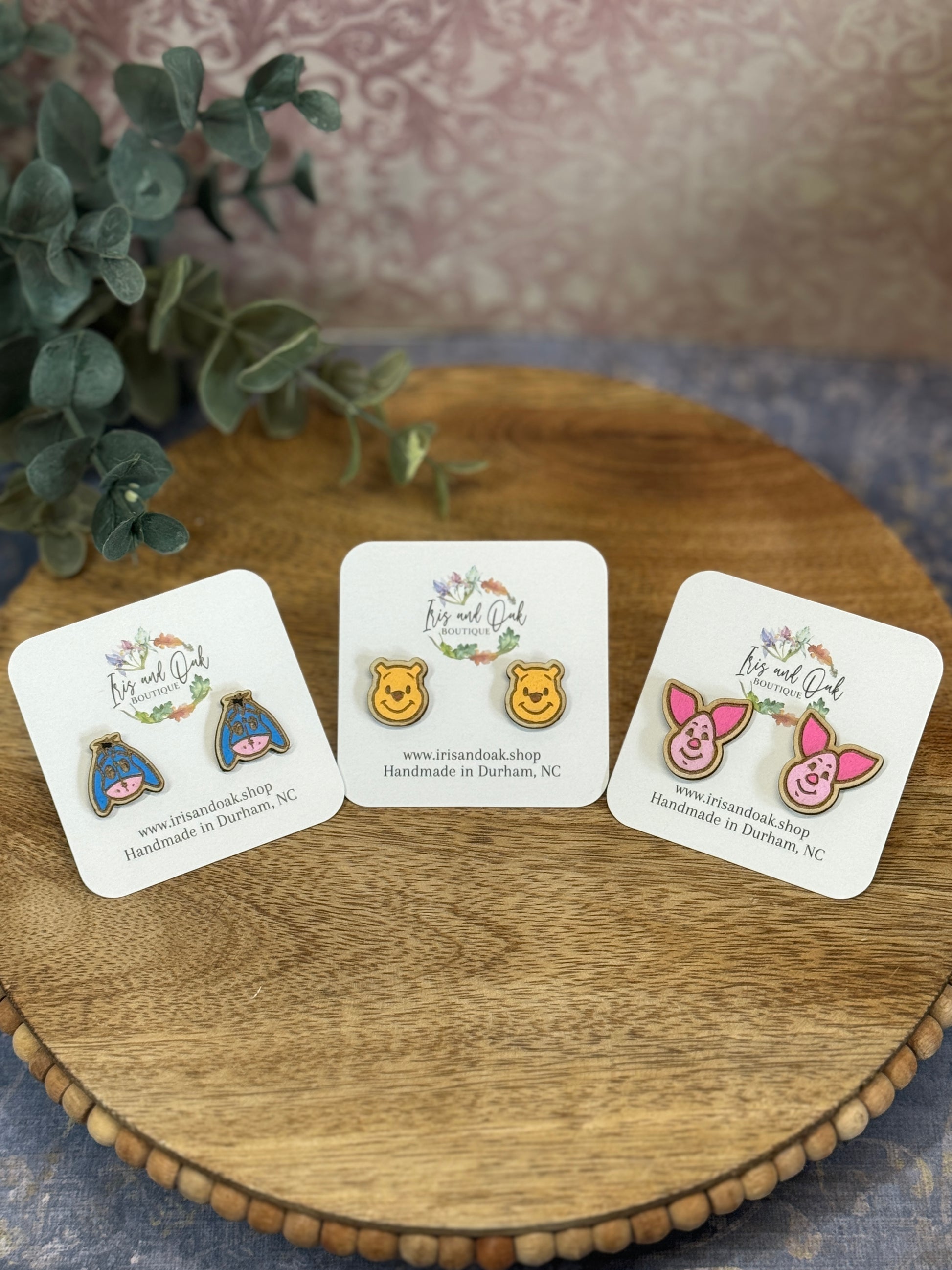 Add a touch of whimsy with our Winnie the Pooh collection of stud earrings! Hand painted with a wooden backing, these earrings feature three beloved characters from Winnie the Pooh. Embrace your playful side with this quirky accessory. (Only for serious fans of Pooh!)