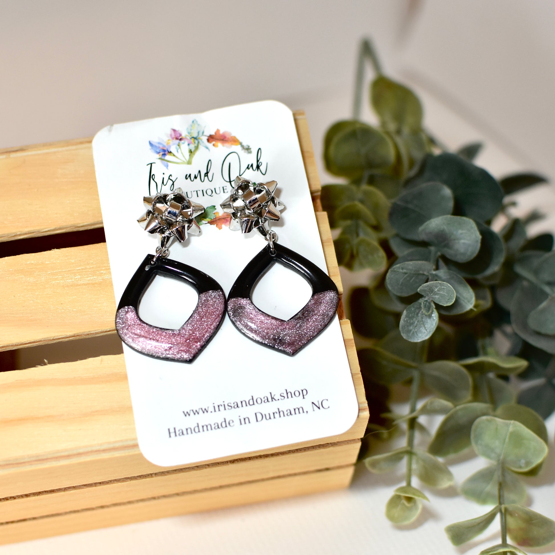 Gift wrap bow studs help bring the party with these shimmery pink dangles.
