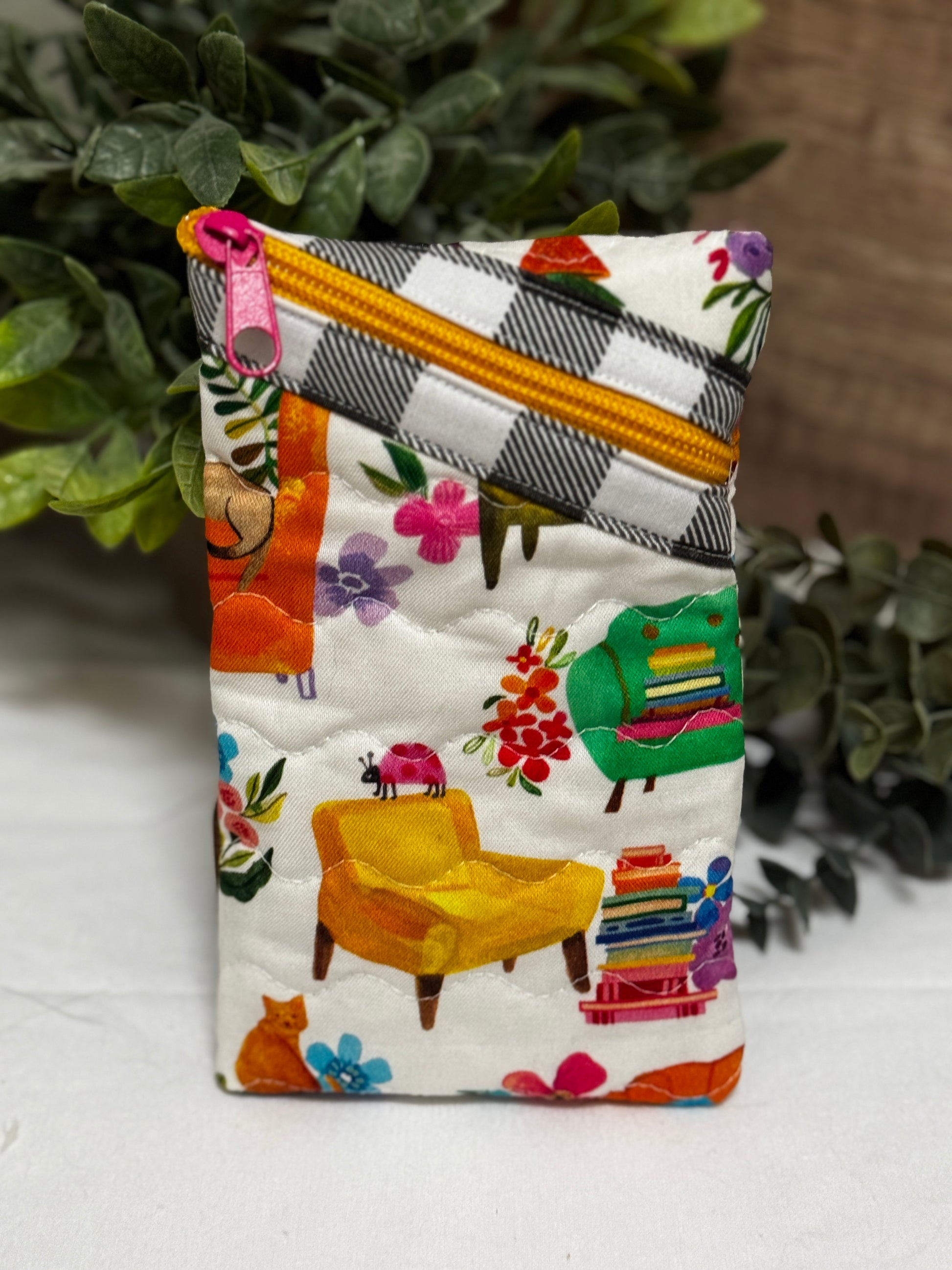 Pouch is made from quality 100% cotton, 100% cotton batting, and a nylon zipper. Interior seams are serged for longevity. To spot clean, use a mild detergent and cold water. Iron on high (but avoid the zipper!) to get rid of any wrinkles.