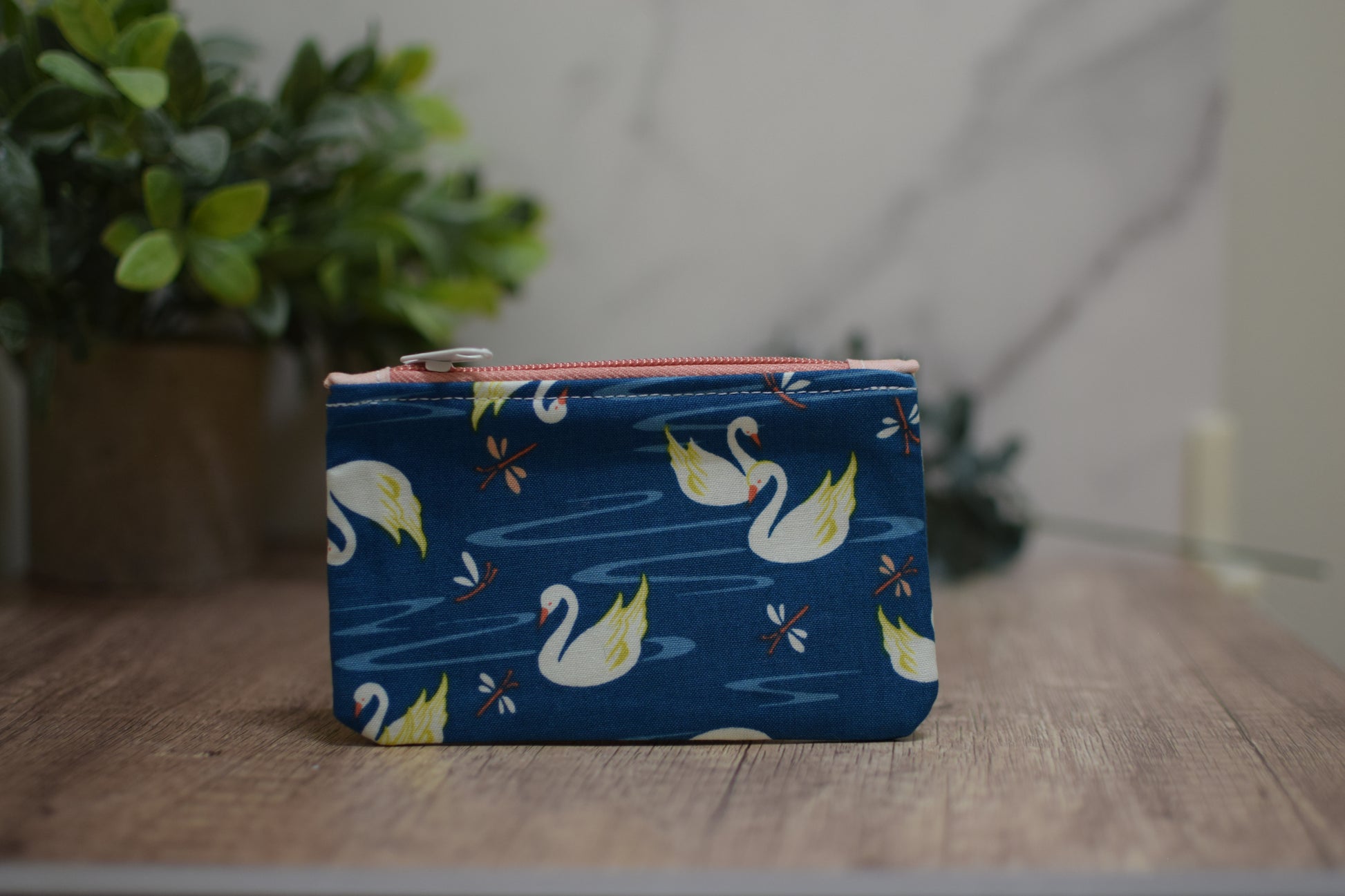 Hand sewn zipper pouch, fully lined. 100% cotton. Spot clean with cool water and mild detergent.