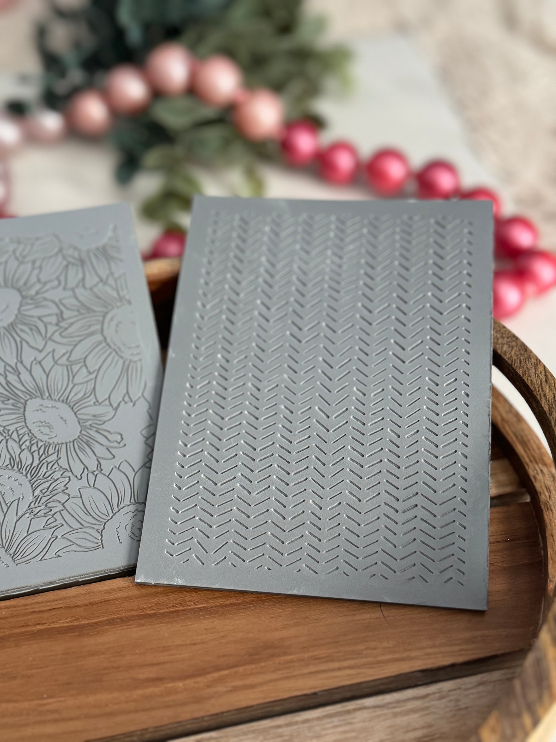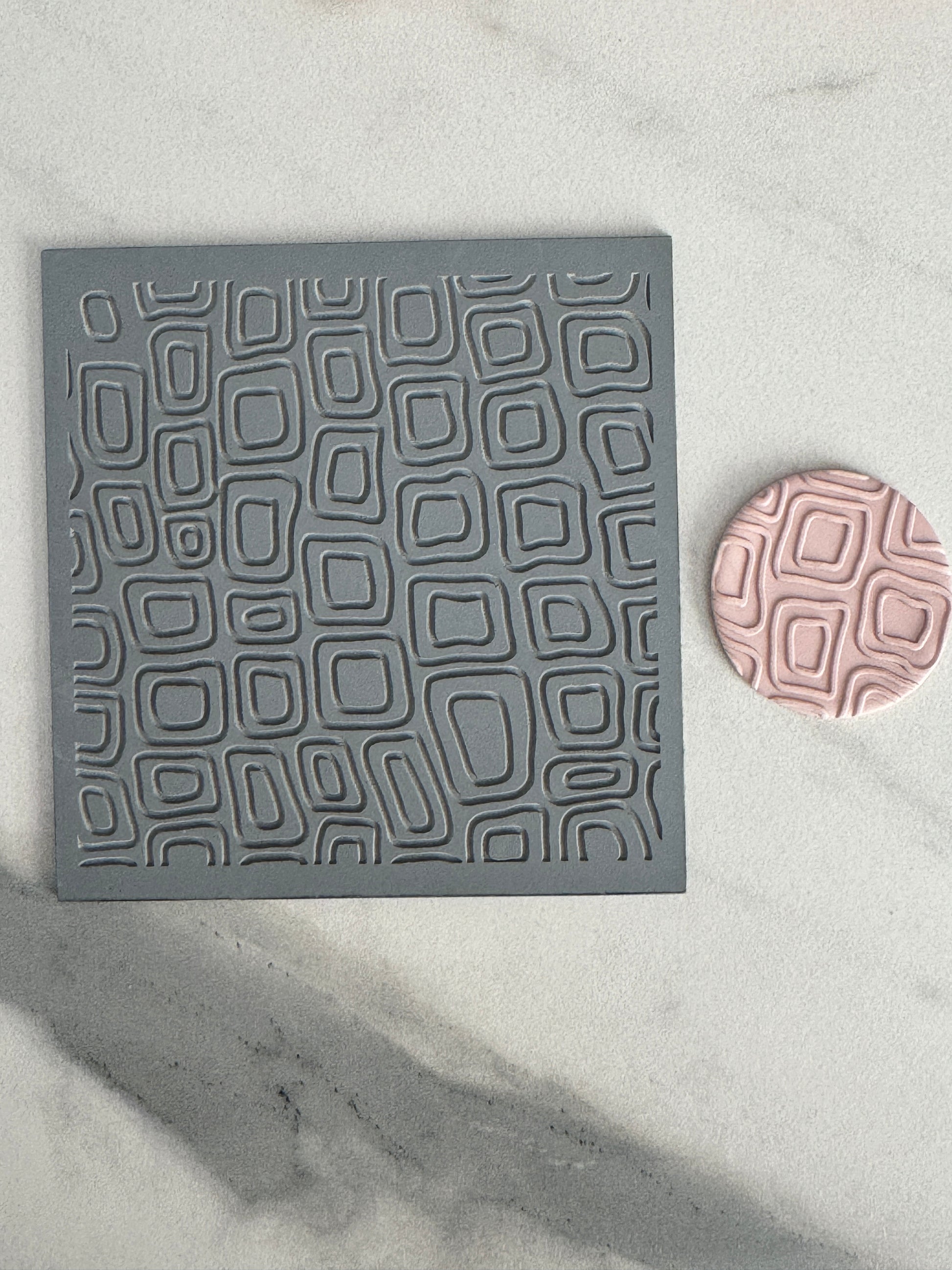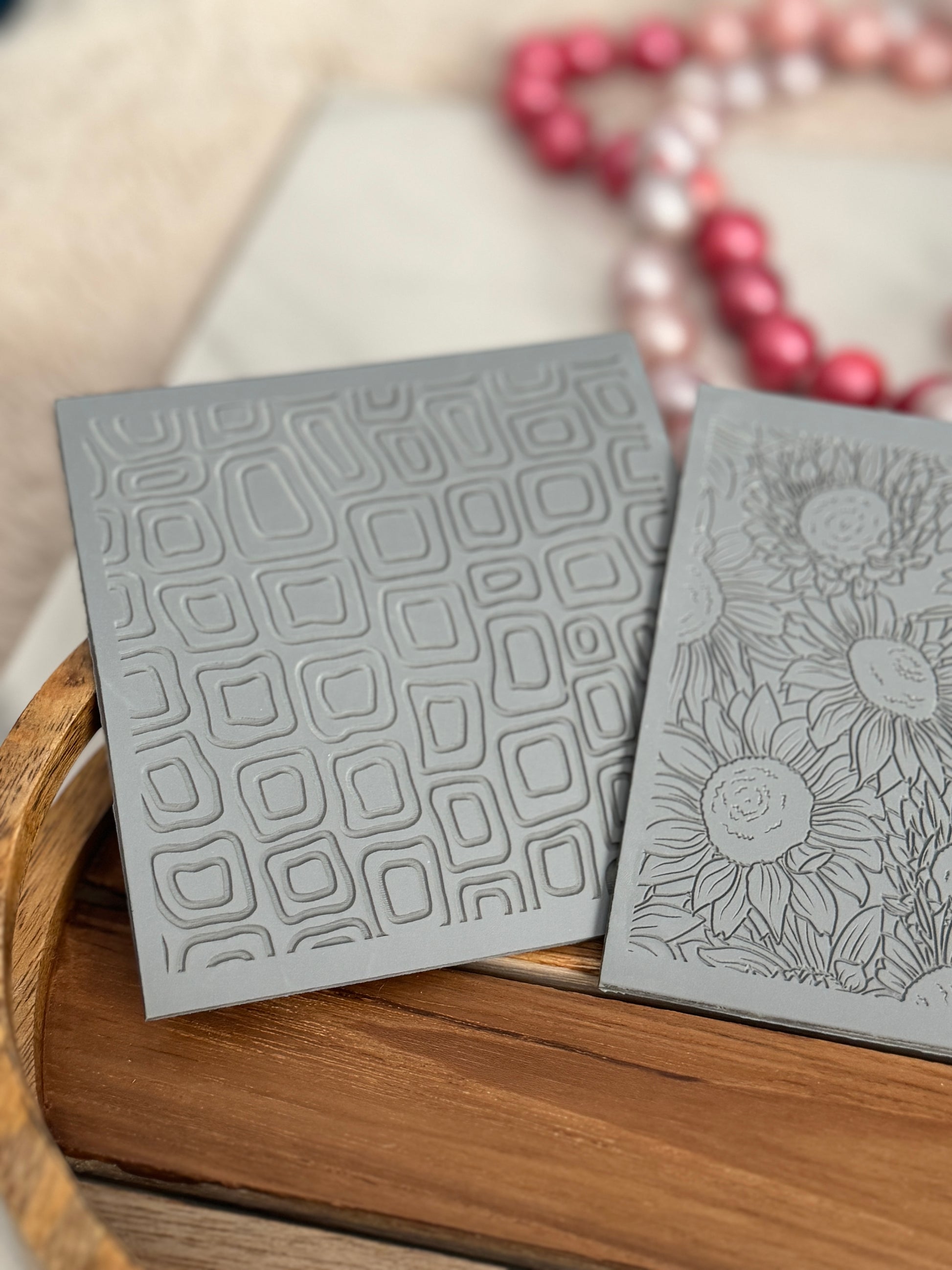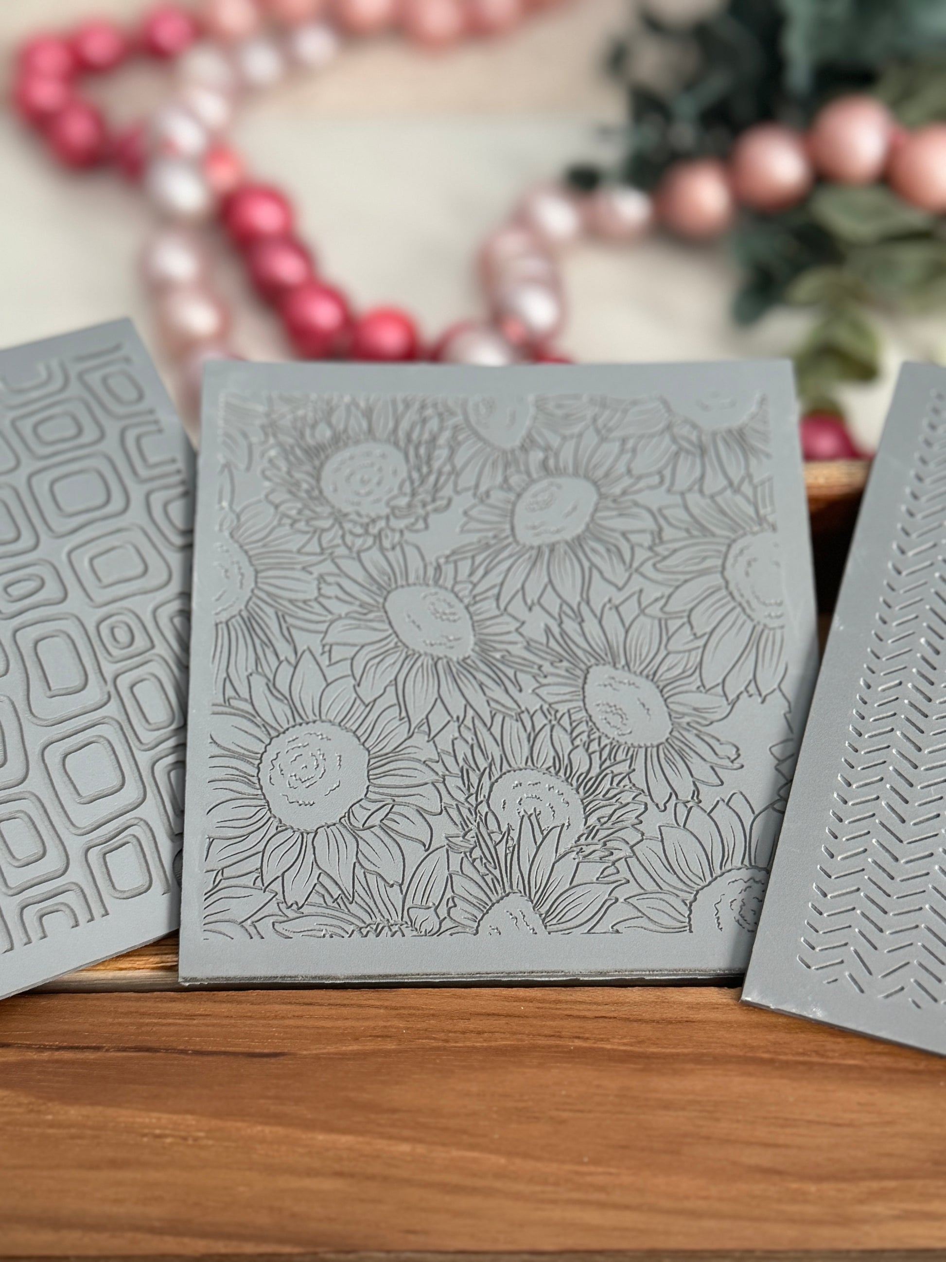 These texture mats are for use on polymer clay and will produce an embossed effect of the design. Designs are approximately 3.8"x3.8".