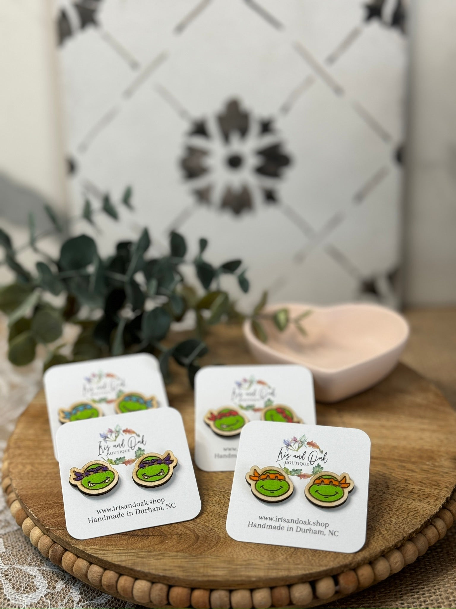 Add some turtle power to your accessories with our TMNT Stud Collection! These cute wooden earrings are hand painted and lightweight for comfortable wear. Cowabunga!
