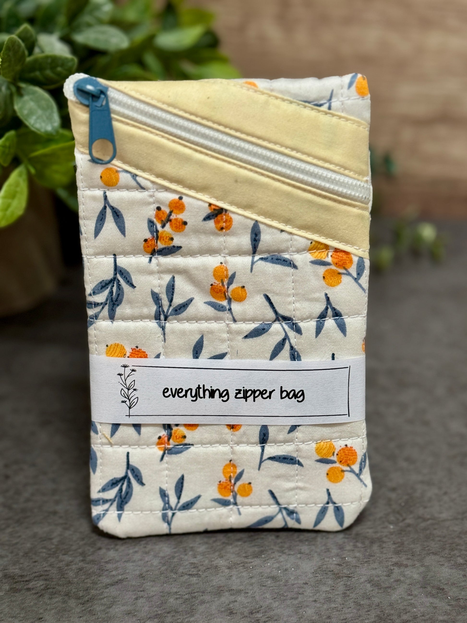 Pouch is made from quality 100% cotton, 100% cotton batting, and a nylon zipper. Interior seams are serged for longevity. To spot clean, use a mild detergent and cold water. Iron on high (but avoid the zipper!) to get rid of any wrinkles.