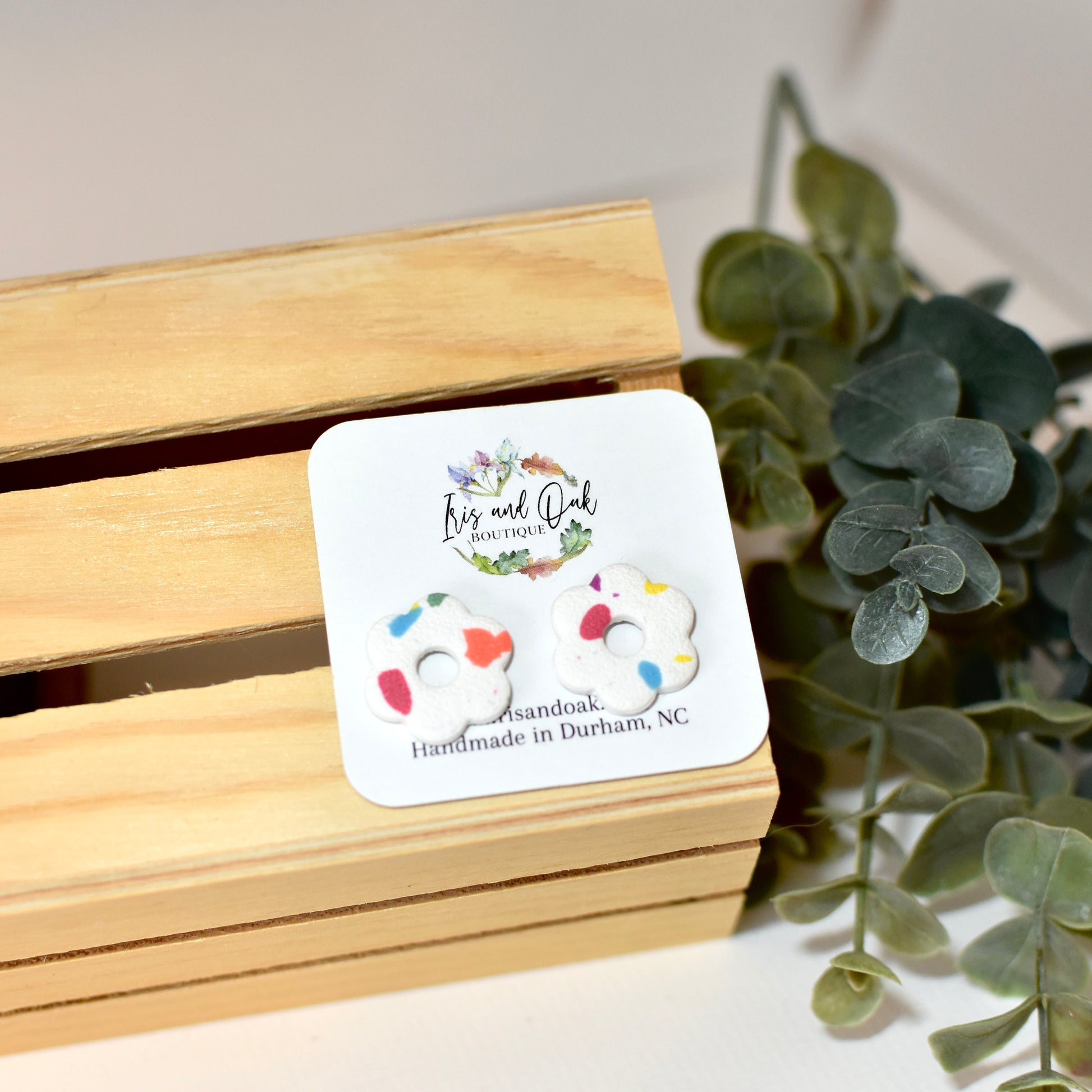 All polymer clay earrings are handmade using high quality polymer clay and other materials. Earrings may use foil leaf, mica powder, alcohol inks, and acrylic paint in the final designs.