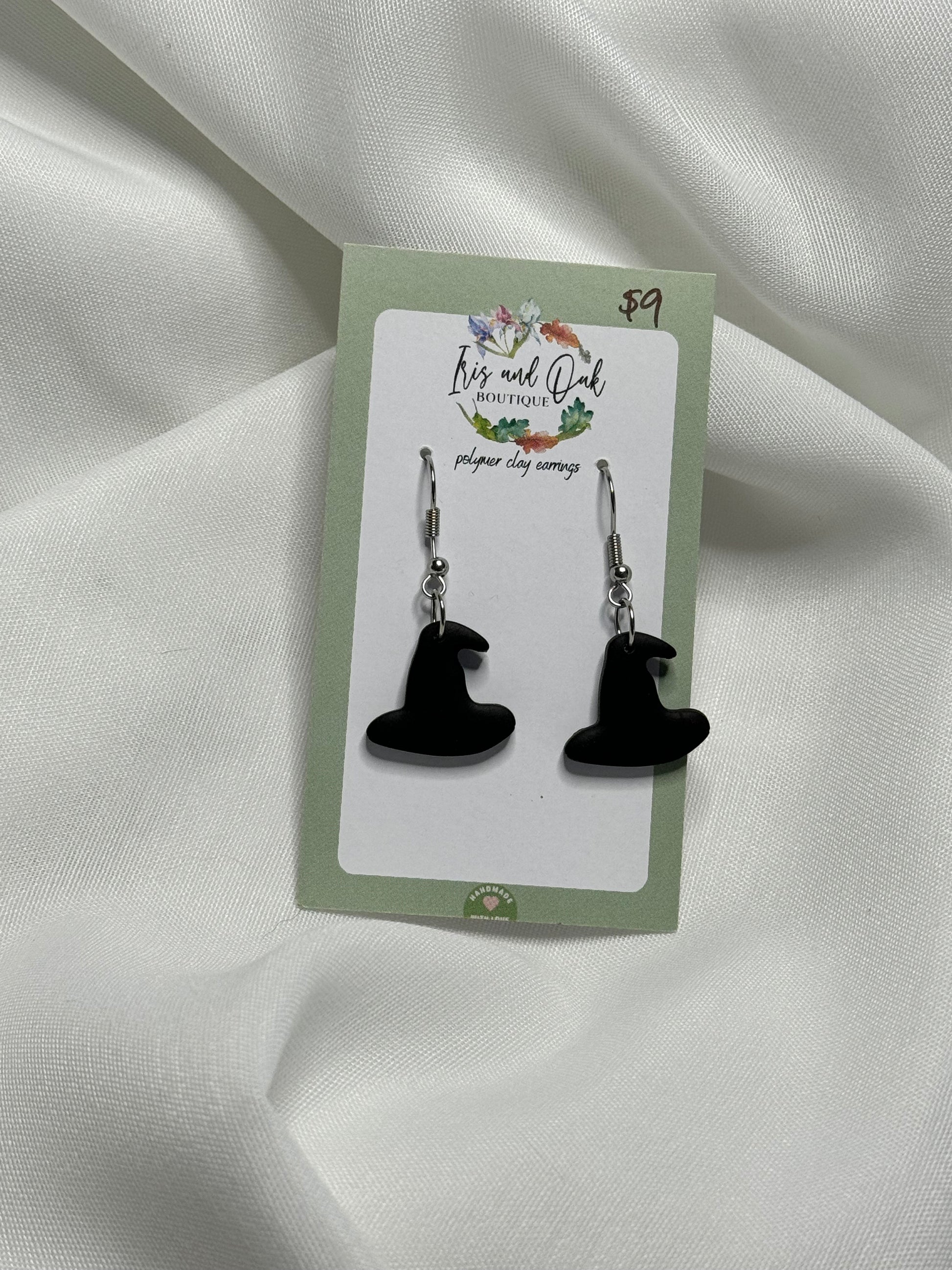 Complete your witchy look with these polymer clay dangle earrings in the shape of a witch's hat. Perfect for adding a dose of magic and style to any outfit. (Not suitable for actual witch flying, unfortunately!)