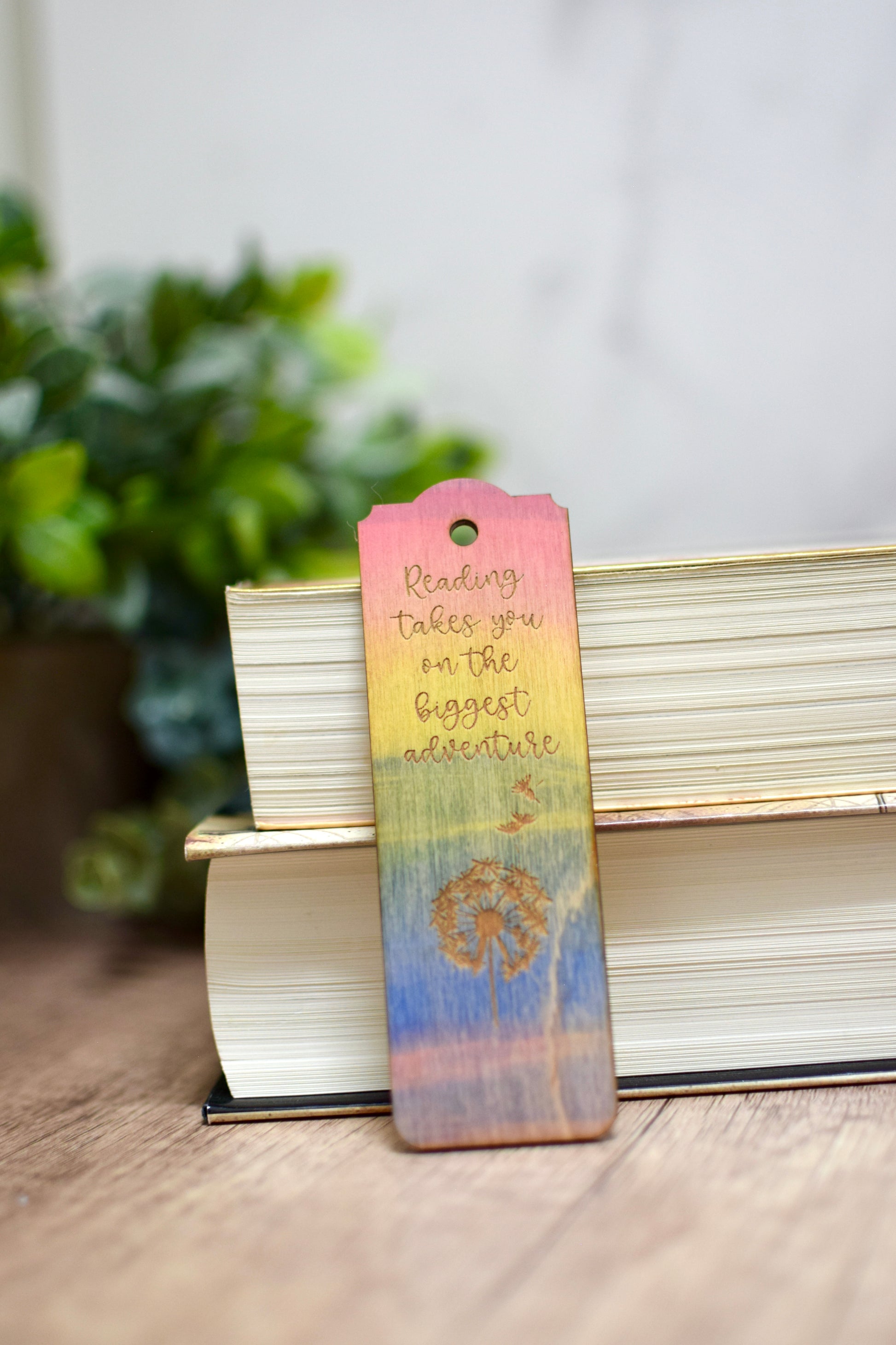 Wooden bookmarks are 1/8" thick and work best in larger hardback books. They are engraved and cut with a laser, and painted with goache and watercolor paints. Bookmarks are approximately 2" x 5"